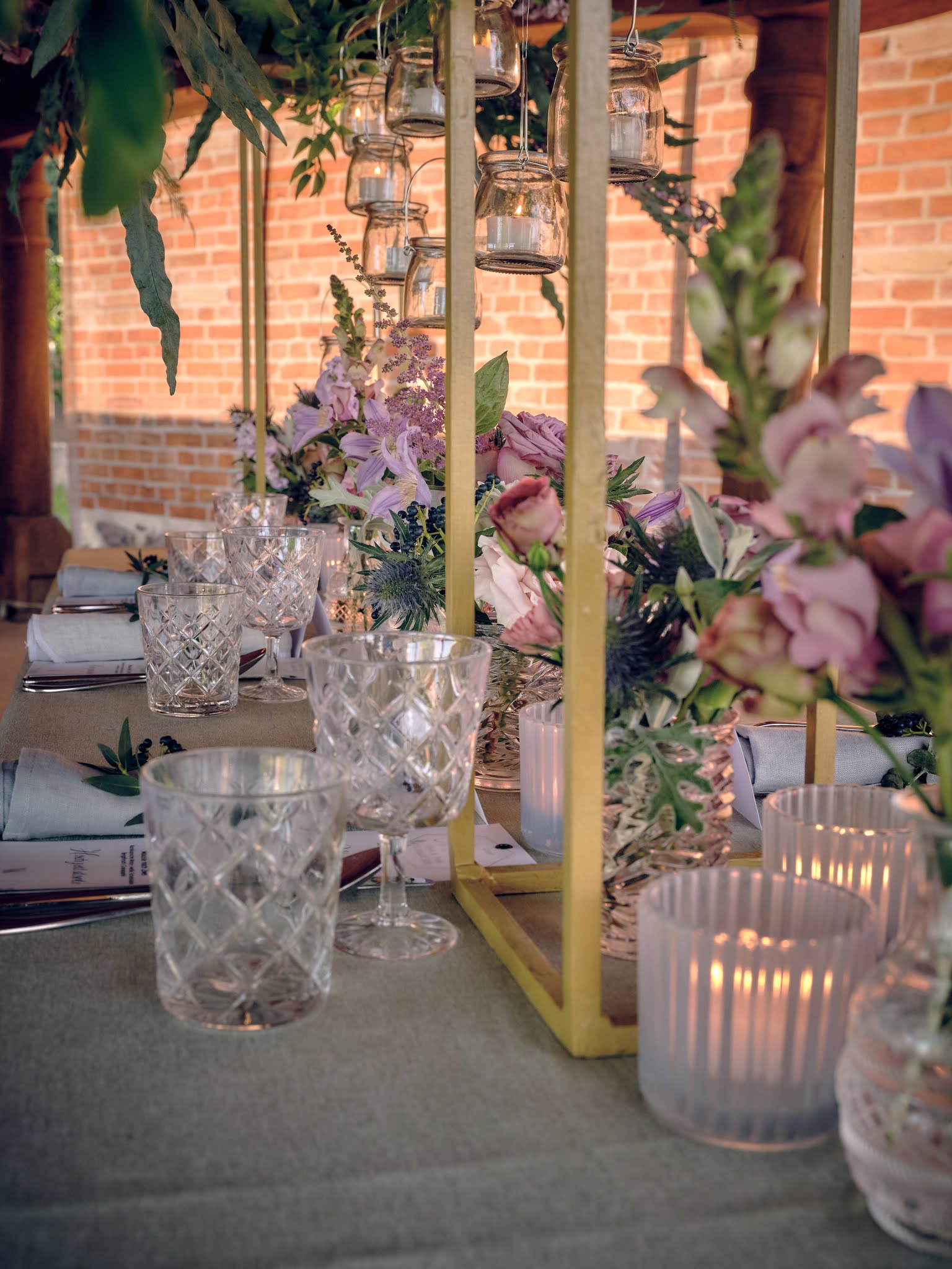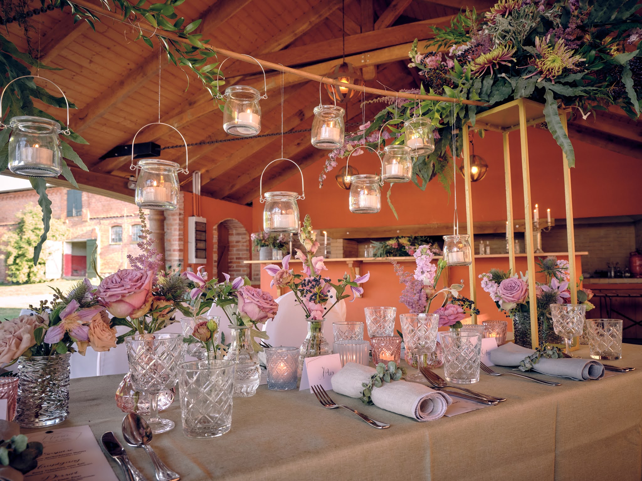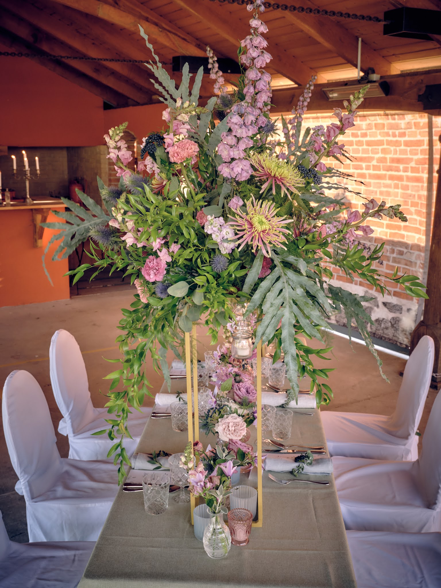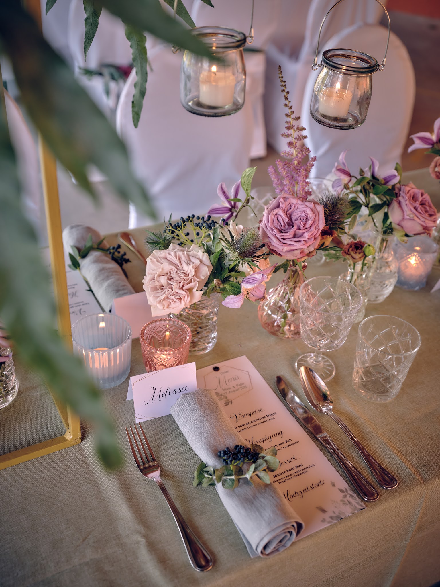 Die Hochzeitstafel wurde dann im Grillstadl des Gutshofes festlich gedeckt. Auch hier waren es wieder zarte Pastellfarben, die von der Ostsee-Blüte (Floristik) und 4 Graphic & Design (Papeterie) zauberhaft umgesetzt wurden. Bei der Tischwäsche hatten wir uns für ein zartes Eukalyptusgrün entschieden, die Servietten waren graublau mit kleinen Blätterkränzen.