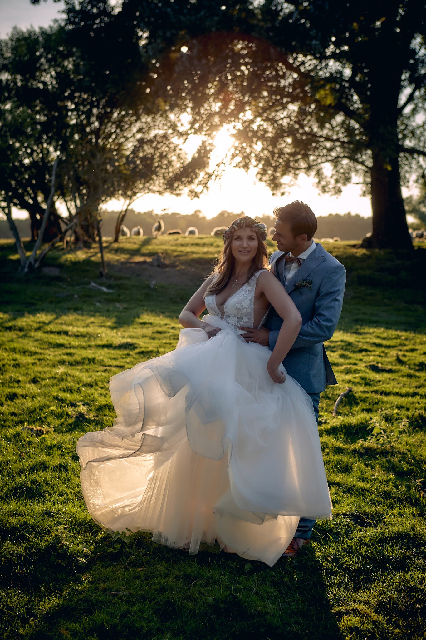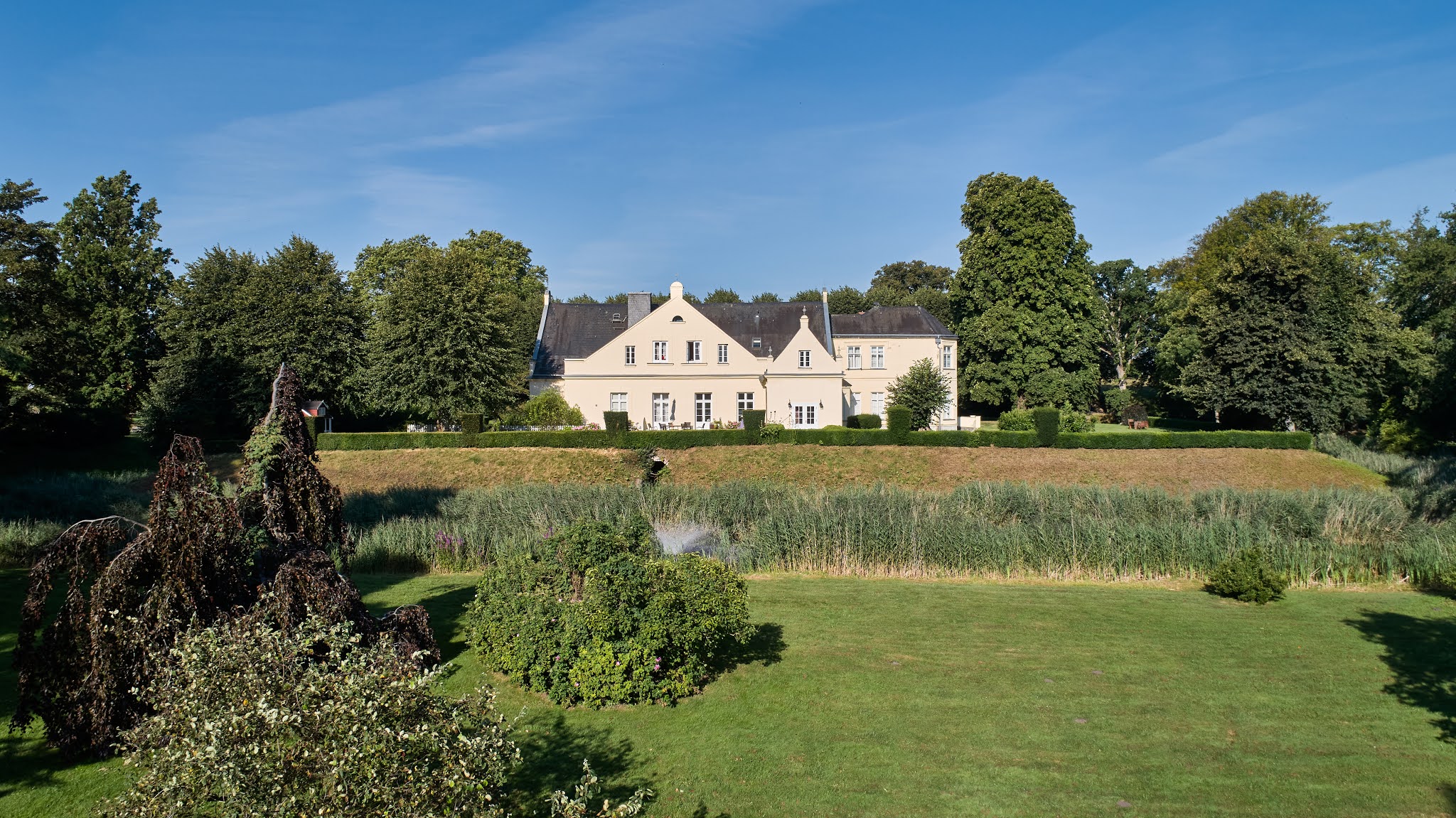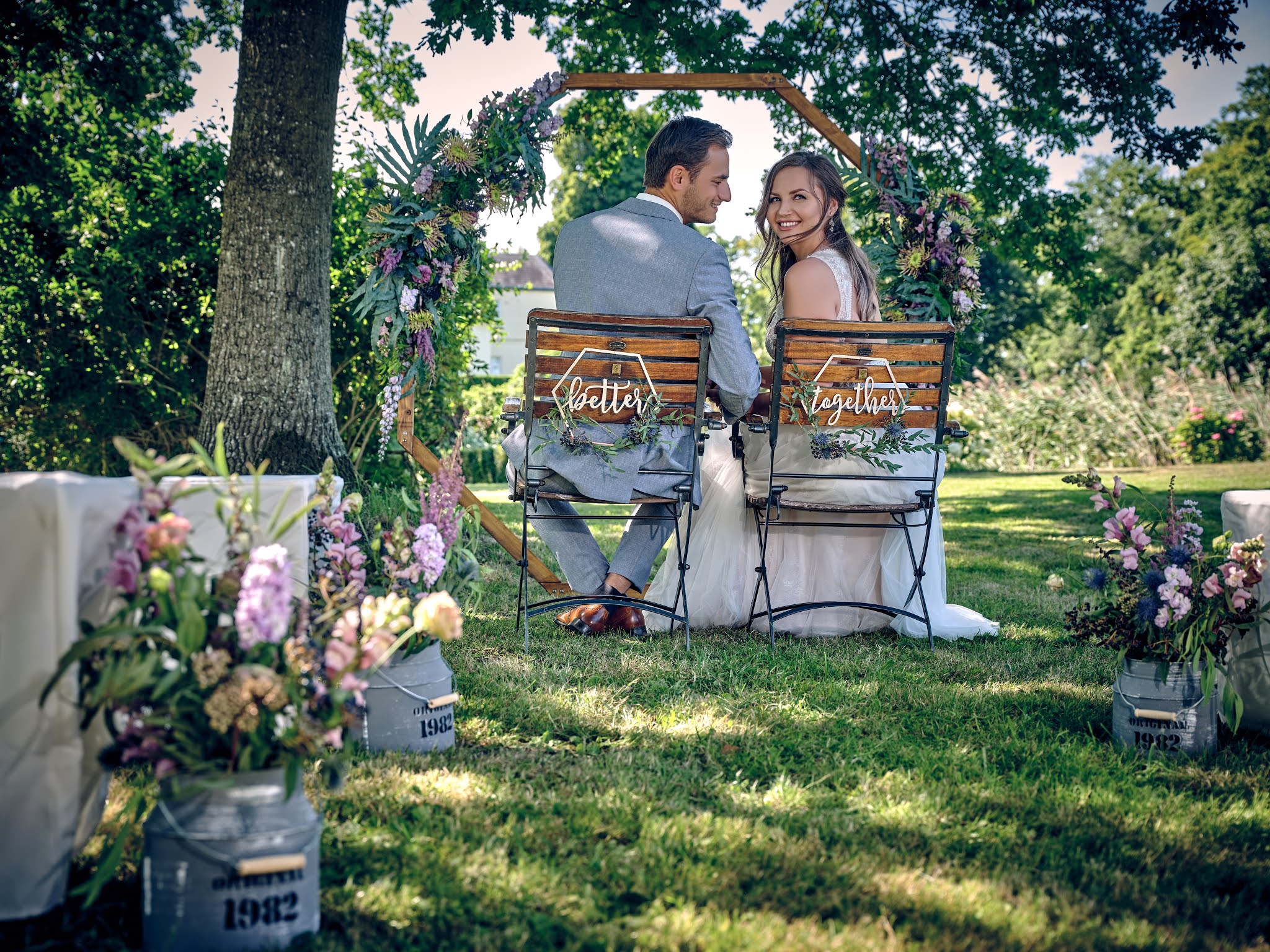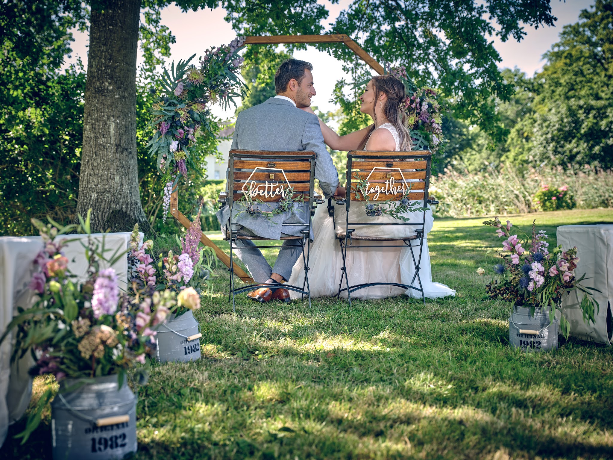 Für eine Trauung im Grünen unter freiem Himmel ist der weitläufige Park des Gutshofes einfach perfekt. Riesige alte Bäume dienen als Schattenspender an heißen Sommertagen, im Teich plätschert leise eine Fontäne und im Hintergrund weites Land und Pferdekoppeln – Landhochzeitsromantik pur.