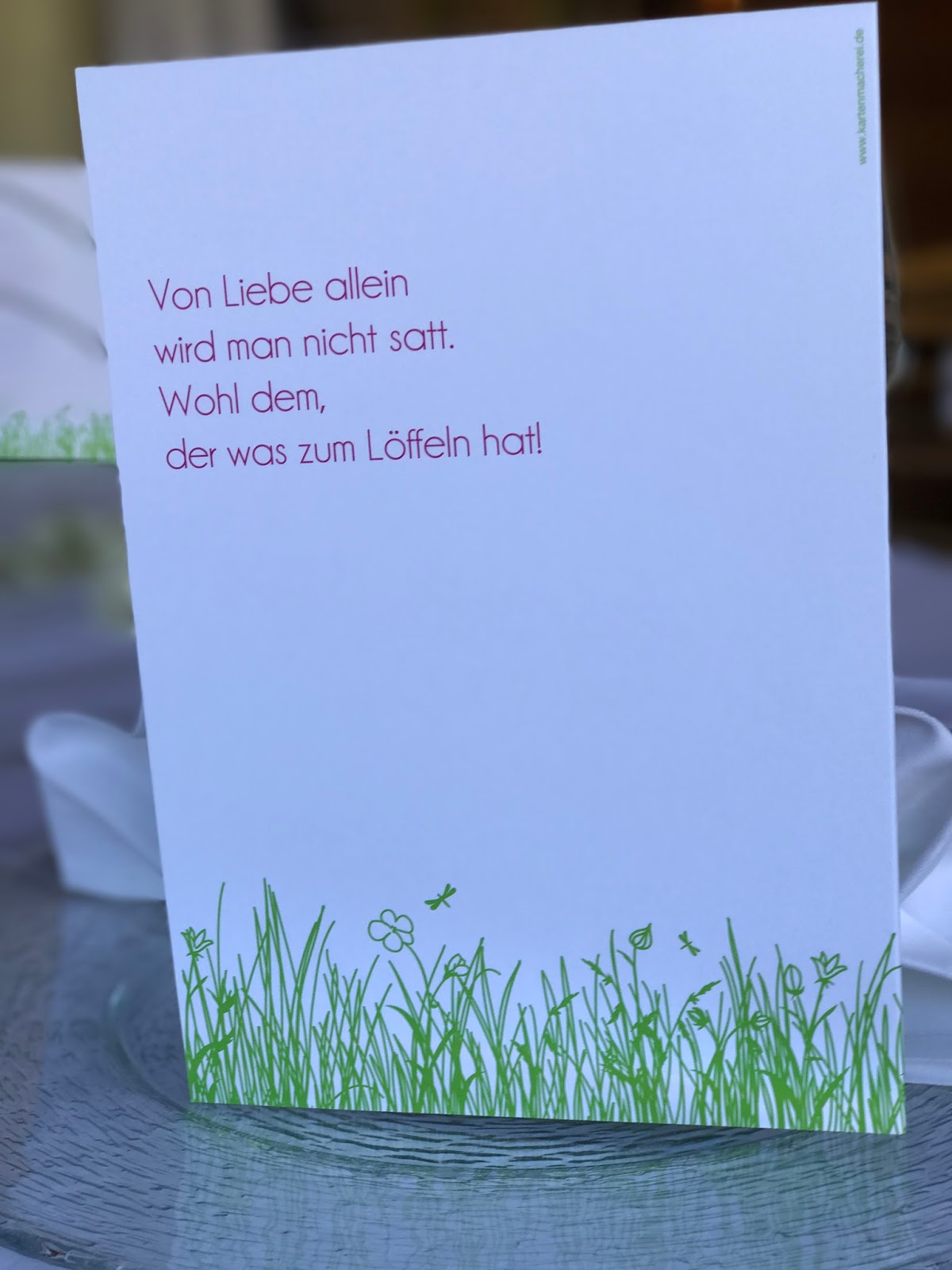 | Der Spruch auf der Rückseite der Menükarten war ein besonderer Gruß des Brautpaares an seine Gäste. |