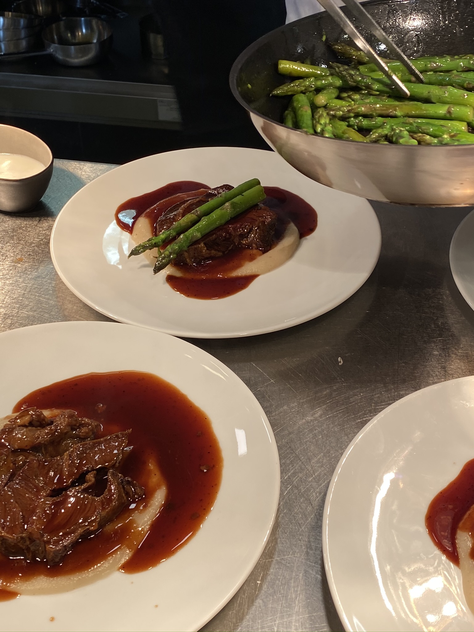 Das Essen ließ keine Wünsche offen, Tatar von Almfleisch Lechner mit Wachtelei als kleiner Gruß aus der Küche vorweg, geschmorte Ochsenbackerl oder Saibling aus der Mittenwalder Fischzucht im Hauptgang, begleitet von den wunderbaren 4Eck-Pommes, hausgemachtem Kartoffelstampf und Pflücksalat, und schließlich ein kleines Tischbuffet mit allerlei süßen Köstlichkeiten wie Mini-Blumentöpfen, Friesentorte im Glas, Macarons und verschiedene Sorbets.