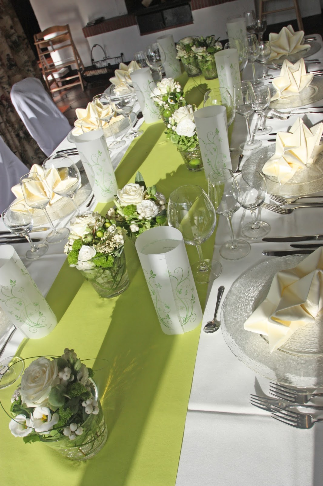 Cremefarbene Tischwäsche wurde mit einem grünen Tischläufer von Duni ergänzt, dazu cremefarbene Servietten (Doppelstern-Faltung) auf Glasplatztellern und das festliche Menü zum 1. Hochzeitstag wurde auf Transparent-Papier gedruckt und später von Innen mit Glaswindlichtern beleuchtet.