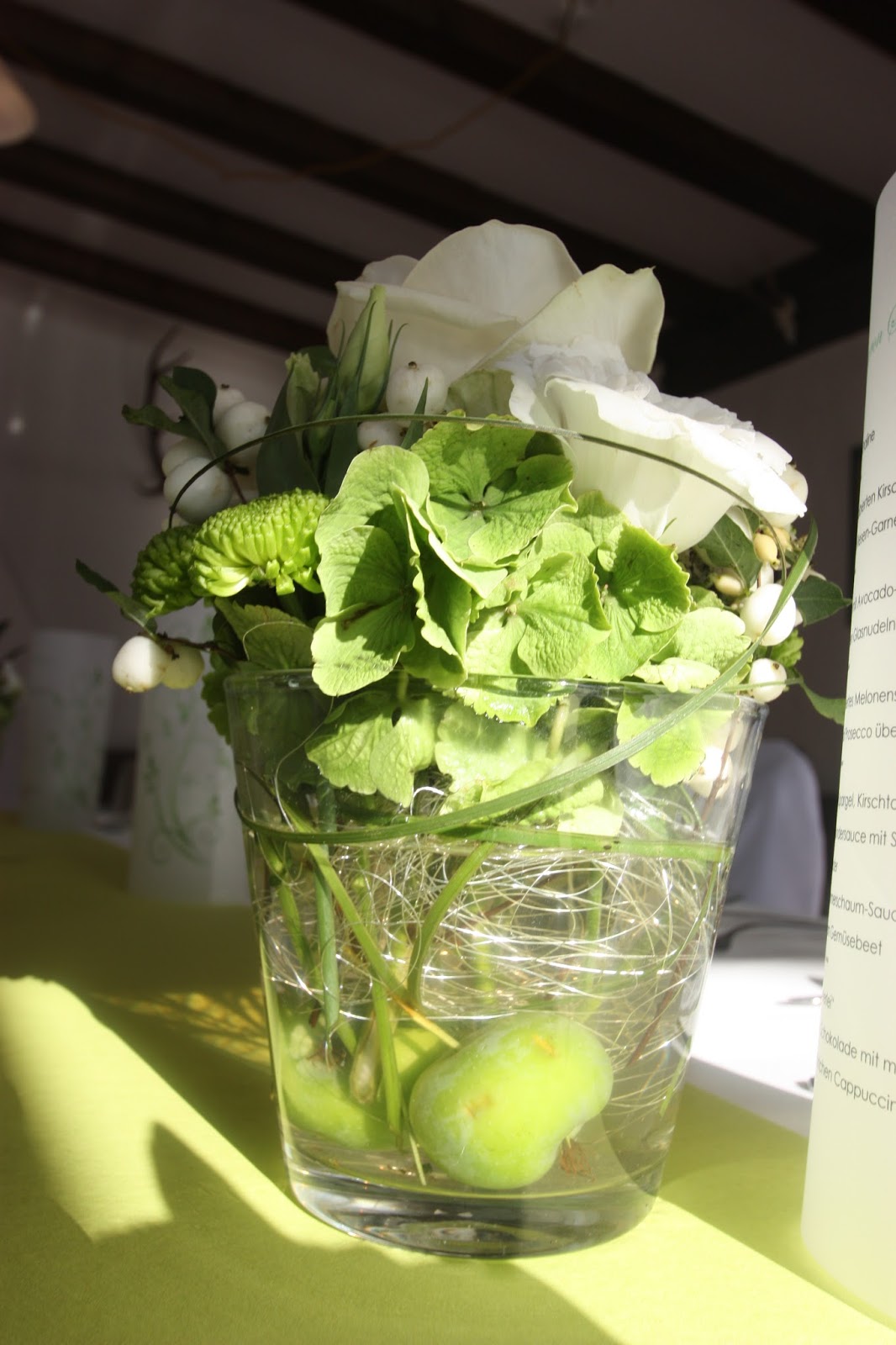 Für die Blumen-Arrangements war – wie schon bei der Hochzeit ein Jahr zuvor – Passiflori Penzberg verantwortlich. Die Farben Creme, Weiß und Grün wurden wieder aufgenommen mit grünen Hortensien, Rosen, Mummies, weißen Beeren außerdem Silberdraht und kleinen grüne Äpfelchen, arrangiert in großen Gläsern.