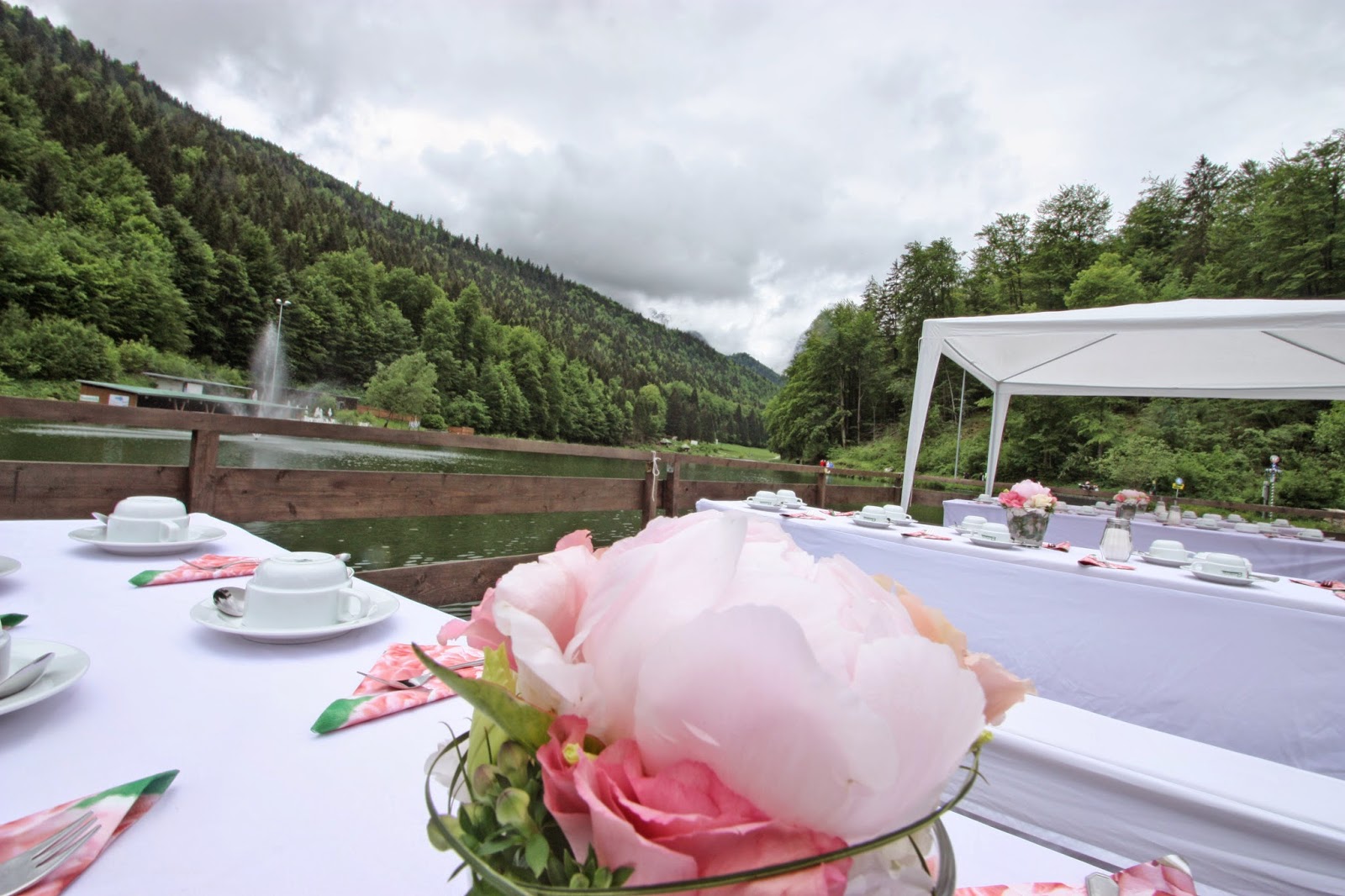 Die freie Trauung war auf der Panorama-Wiese über dem Seehaus geplant und bis zum Morgen war es eine Zitterpartie, ob Petrus mitspielen und den inzwischen sechs Tage anhaltenden Regen enden lassen würde. Und das Warten hat sich gelohnt: Zwar kam die Sonne nur zögerlich hinter den dicken Wolkenbergen hervor, aber es regnete nicht mehr und die Temperaturen stiegen auf ein erträgliches Maß. Der Wunsch des Brautpaares war es, die Trauung wenn nur irgend möglich draußen stattfinden zu lassen und so ignorierten wir die doch noch recht nasse Wiese und machten uns an den Aufbau der „Hochzeitswiese„. Für die Gäste gab es Bänke mit weißen Hussen und das Brautpaar schritt durch den Mittelgang auf den Altartisch zu und nahm auf Stühlen mit weißen Hussen unter einem mit einer Pfingstrosen-Girlande geschmückten Rosenbogen Platz. Die Hochzeitsrede wurde dann feierlich gestaltet von den Tiroler Hochzeitsrednern – ich hatte nun bereits das Vergnügen, mehrere der Damen zu erleben und bin immer wieder begeistert von der Herzlichkeit und Individualität. Leider hielten sich die Waxensteine noch eine Weile in ihrem Wolkenbett versteckt, zur Sicherheit hatten wir auch noch Schirme aufgestellt – die aber Gott-sei-Dank nicht mehr gebraucht wurden. Da die Weg zur Wiese aber noch sehr nass war, wurde die Braut zur Sicherheit mit dem Golfcart zur Wiese gebracht. Kleine Anekdote am Rande: Es blieb auf der Rückfahrt im Kuhdung stecken – und ich zündete in Gedanken eine Kerze für den Schutzengel an, der verhindert hatte, dass das MIT der Braut an Bord passierte…
