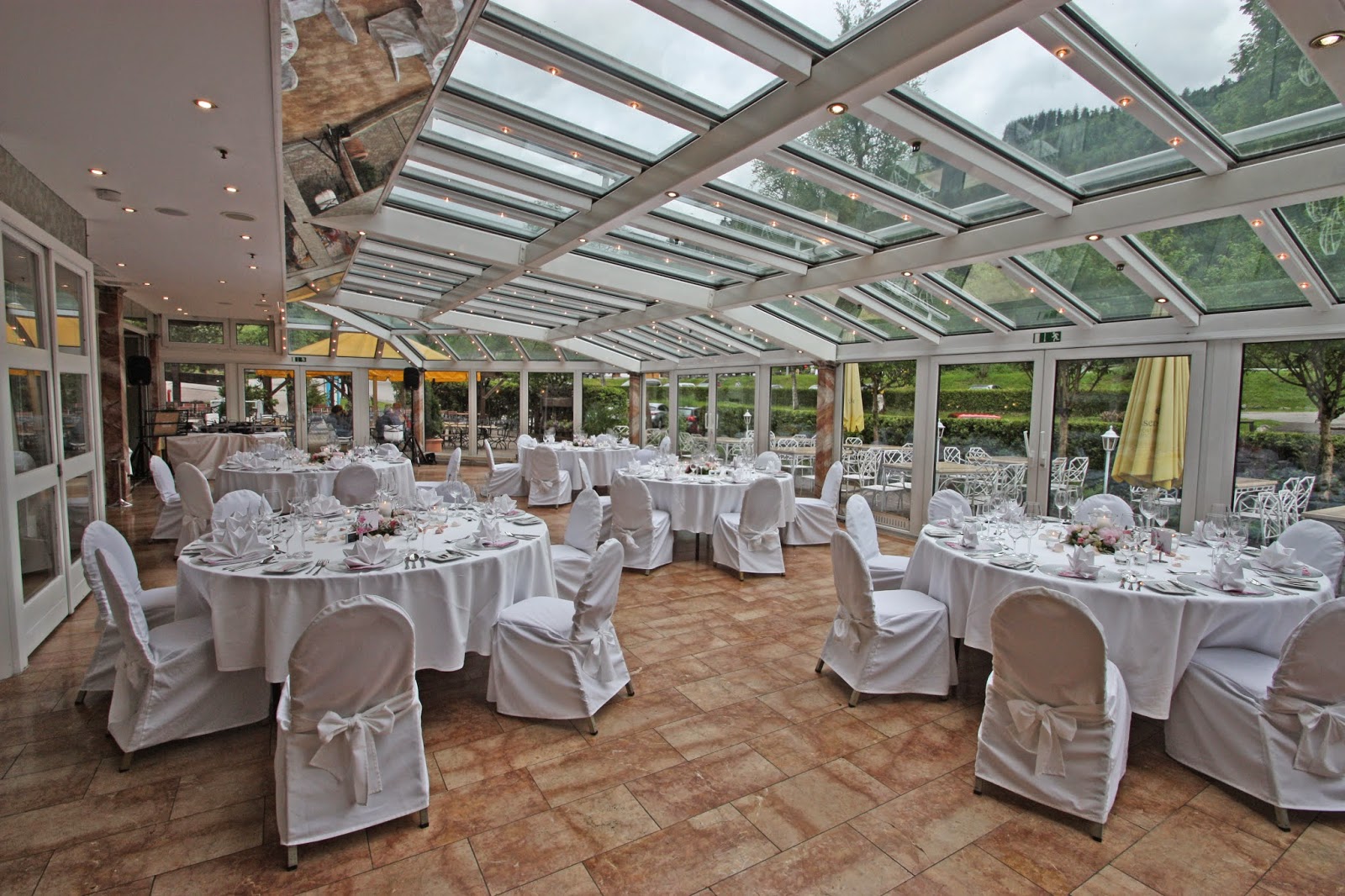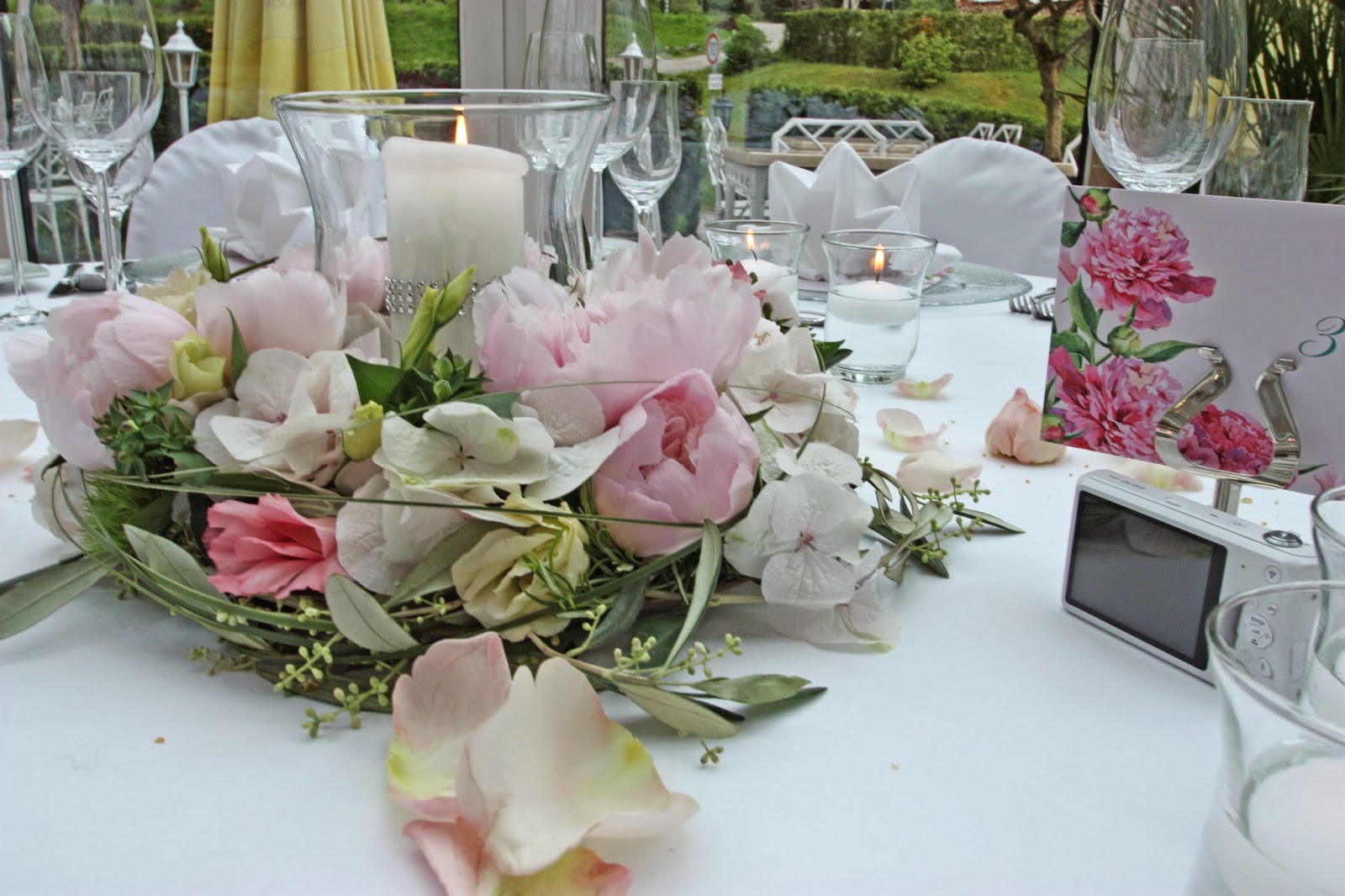 Das Abendessen fand im lichtdurchfluteten Sommergarten unterm Sternenhimmel im Hauptgebäude des Riessersee Hotel Resorts statt. Die runden Tische waren in festlichem Weiß gedeckt, die Stühle mit weißen Hussen verkleidet. Glasplatzteller und Glaswindlichter mit weißen Schwimmkerzen sorgten für ein verspieltes, leichtes Design im Gesamtkonzept, das Center Piece bildeten Kränze aus Pfingstrosen mit Glaswindlichtern, in denen weiße Stumpenkerzen, verziert mit einem Band aus glitzernden Straßsteinchen, platziert waren. Dazu passend wurden die Menükarten und die Karten mit den Tischnummern ebenfalls mit einem Pfingstrosen-Motiv versehen. Die Papiterie wurde von der Kartenmacherei nach einer Vorlage des Brautpaares konzipiert und gedruckt. Als Serviettenform wurde der Doppelstern gewählt