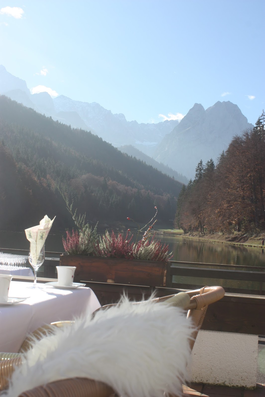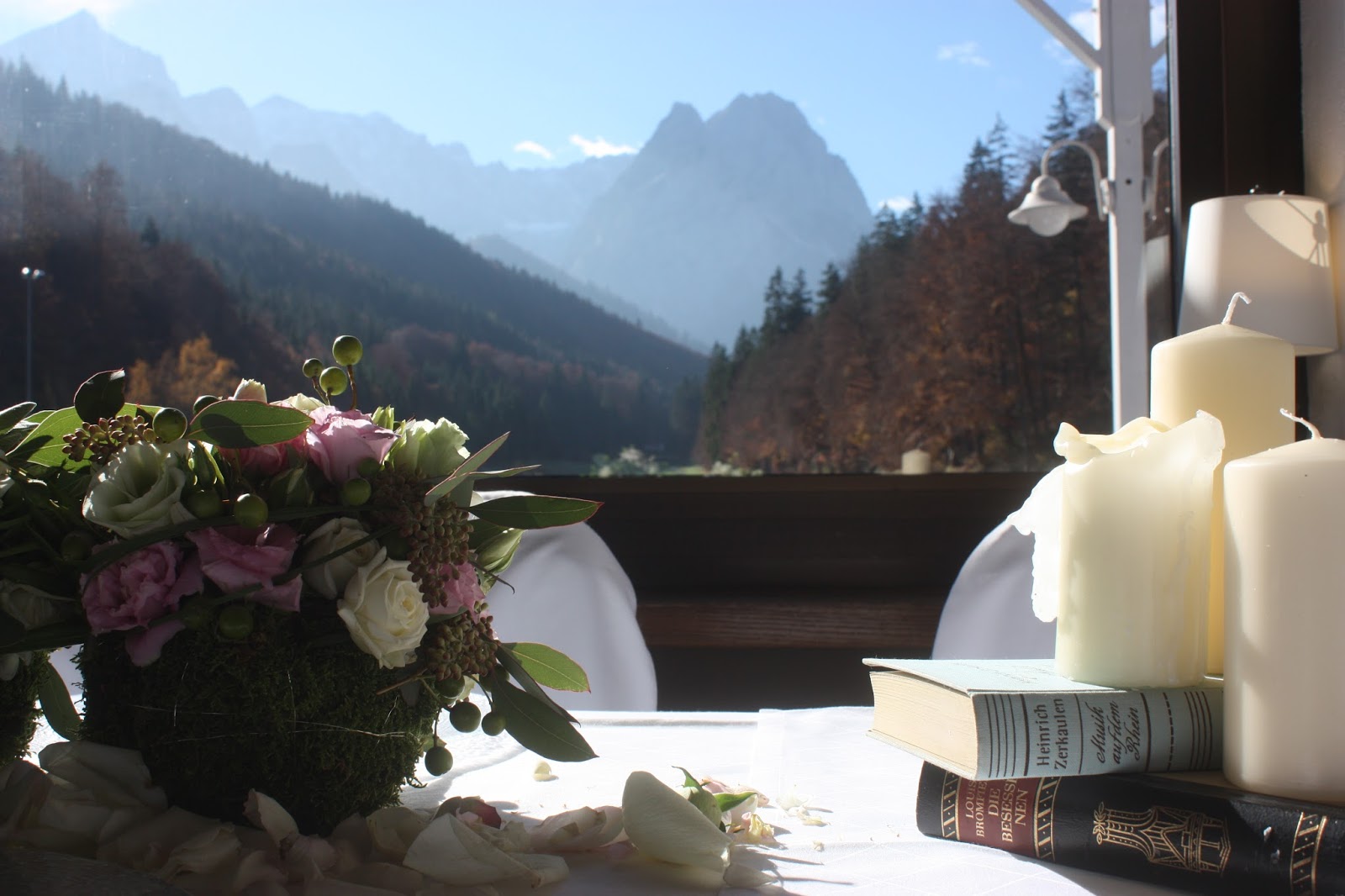 Es ist soweit: die letzte Hochzeit der Saison 2016 im Riessersee Hotel Garmisch-Partenkirchen hat stattgefunden. Und es war ein würdiger Abschluss. Ab mittags strahlte die Herbstsonne vom blauen Himmel, die Luft war warm und klar und das Wettersteingebirge spiegelte sich im klaren Wasser des Riessersees. Für die Dekoration waren Rose, Grün und Weiß, Romantik und Vintage-Look vom Brautpaar gewünscht worden, Feuerschale, Punsch und viele Kerzen taten das Übrige – es war eine wirklich romantische Herbsthochzeit in den Bergen.
