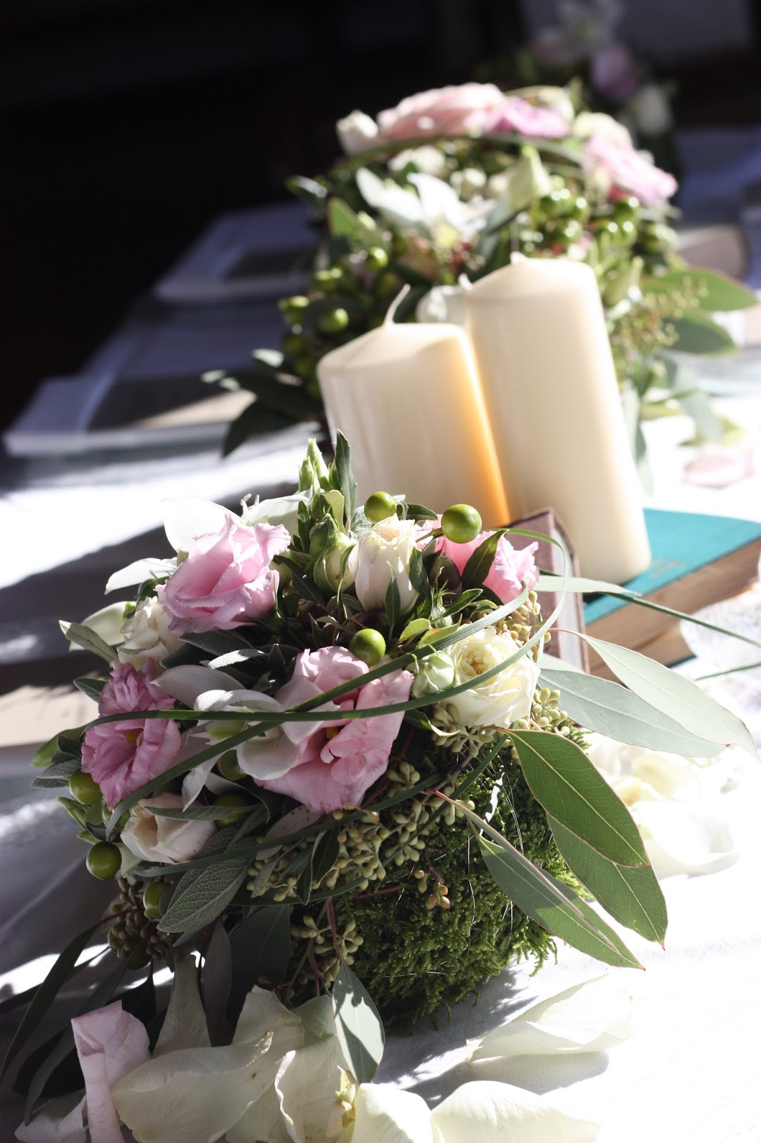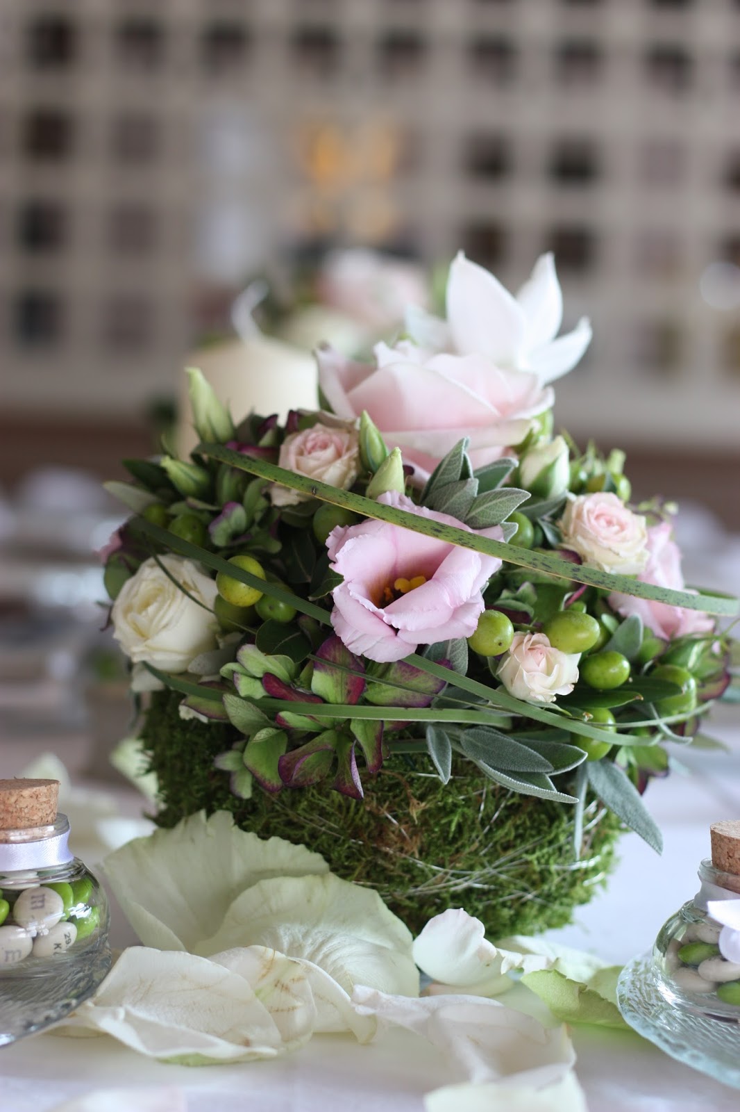 Für den Blumenschmuck zur unserer letzten Hochzeit 2016 hatte ich Passiflori noch einmal etwas Neues und ganz Besonderes einfallen lassen: Die Blumenarrangements waren Mooskugeln, die üppig in Weiß, Grün und Rosa bestückt wurden. Dazu hatten wir alte Bücher arrangiert, dicke Kerzen und einige Vintage-Accessoires wie alte Schlüssel, Holzherzen und Rosenblütenblätter.
