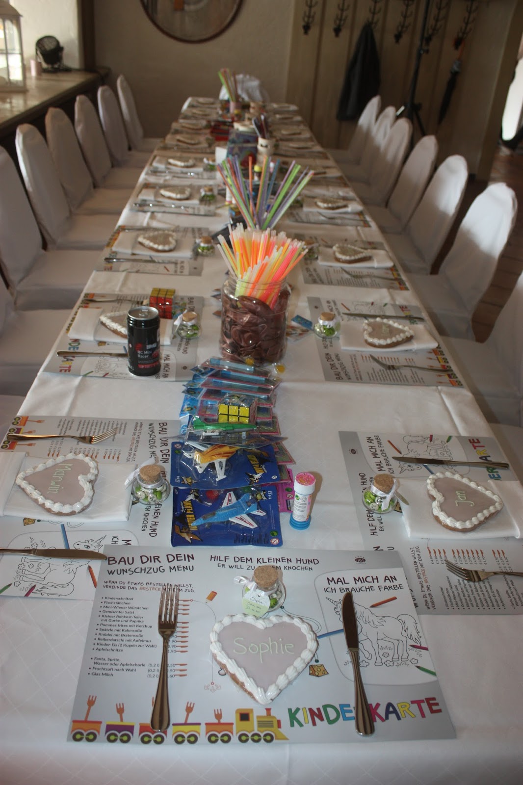 Für die rund zwanzig Kinder war eine eigene große Tafel zum Hochzeitessen vorbereitet worden, mit viel Spielzeug, Süßigkeiten und Bastelsachen. Der Tisch wurde nach dem Dinner weggeräumt und die Kinder zogen ins Jagdstüberl um. wo ein Kinderkino, Comics und weiteres Spielzeug schon warteten, so dass der Platz zum Tanzen genutzt werden konnte.