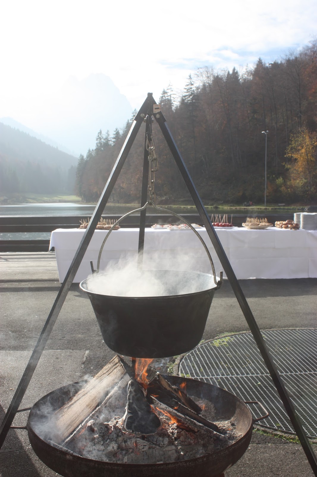 Nach der Kirche traf die Gesellschaft wieder im Riessersee Hotel ein zum Hochzeitsempfang auf der Seeterrasse. Inzwischen hatten sich auch die letzten Morgennebel verzogen und im Herbstsonnenschein konnte man so entspannt Glühwein, Kinderpunsch, alkoholfreien Fruchtcocktail oder Prosecco genießen. Für die Hungrigen gab es hausgemachte Kartoffelsuppe aus dem Kessel über dem offenen Feuer, frische Waffeln mit Schlagsahne, Vintschgerl mit Speck, Butterbrezen oder kandierte Liebesäpfel.