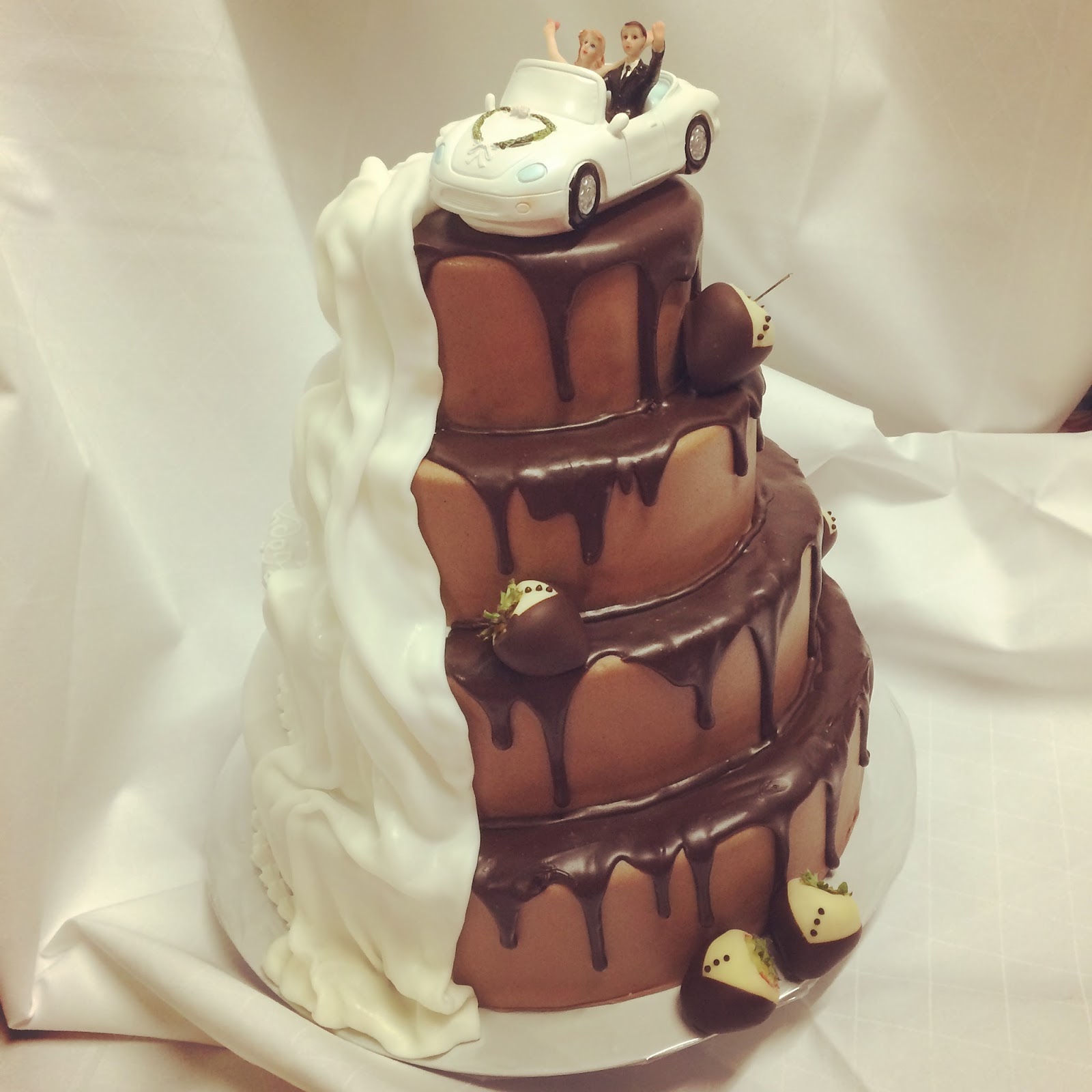 Fehlt natürlich noch die Hochzeitstorte! Sie kam zu vorgerückter Stunde im „Braut & Bräutigam“-Design. Die Konditorei Krönner hatte die schokoladige Köstlichkeit mit fruchtigen Füllungen versehen und mit kleinen Erdbeeren im Frack dekoriert. Als Cake Topper diente das weiße Cabrio, das das Brautpaar ursprünglich für die Fahrt zur Kirche vorgesehen hatte. Auf Grund der doch schon kühlen Temperaturen hatte man sich letztlich doch für einen Mercedes-Oldtimer entschieden, aber so ging der Wunsch zumindest im kleinen noch einma in Erfüllung.