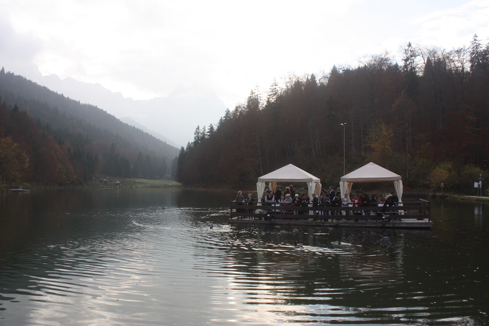 Während der letzten Sonnenstrahlen ging es dann für die Hochzeitsgesellschaft noch zu einer Flossfahrt über den Riessersee. Die Kinder hatten sich vorher mit altem Brot ausgestattet und hatten den größten Spass, unterwegs die Enten zu füttern, die daraufhin dem Floss als Eskorte über den ganzen See folgten.