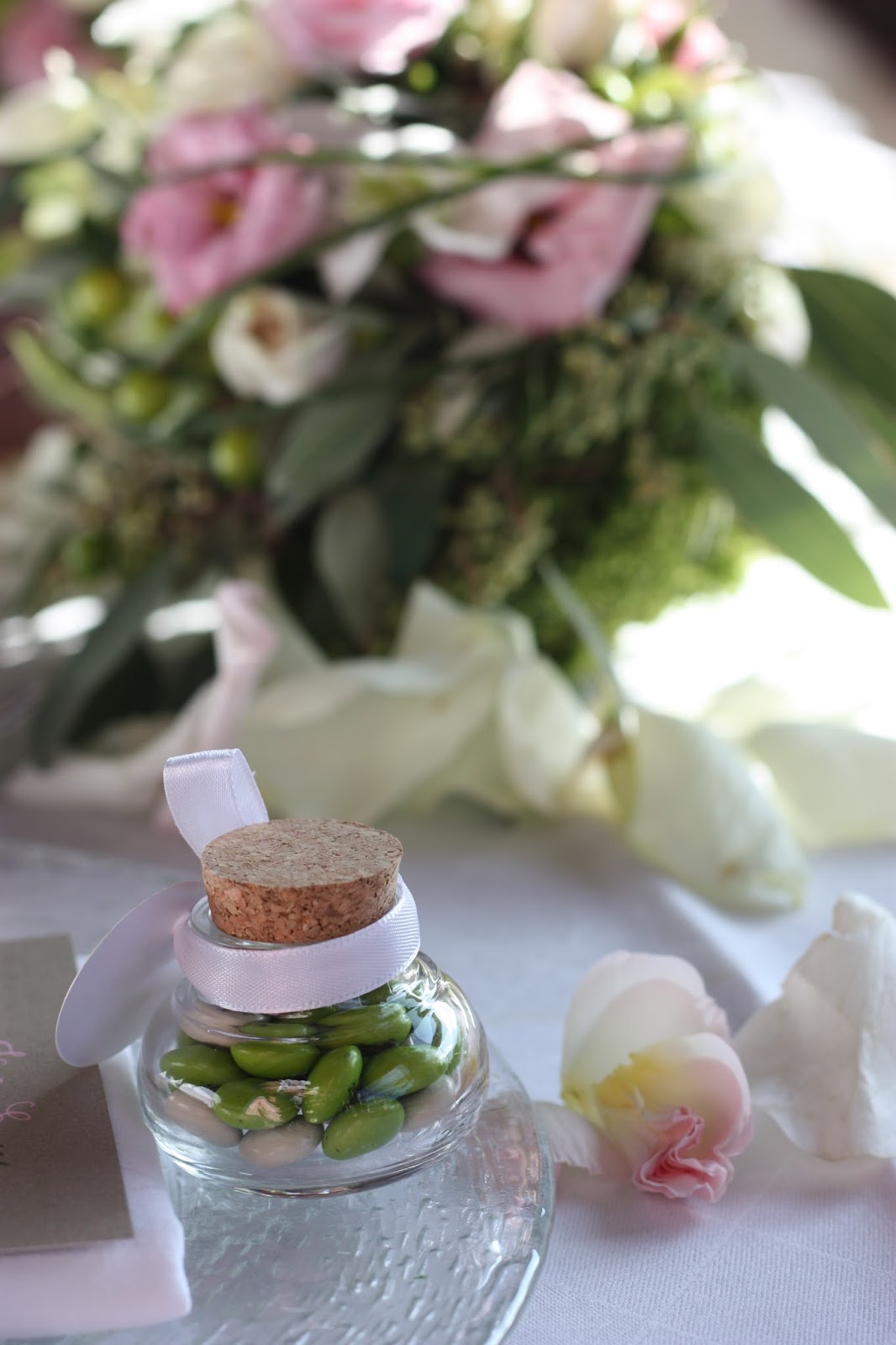 Als Gastgeschenke gab es vom Brautpaar dann noch kleine Glasflakons mit personalisierten M&M´s.