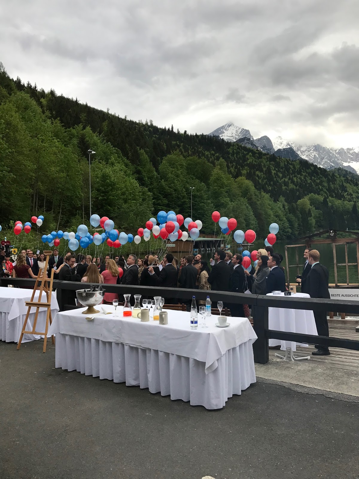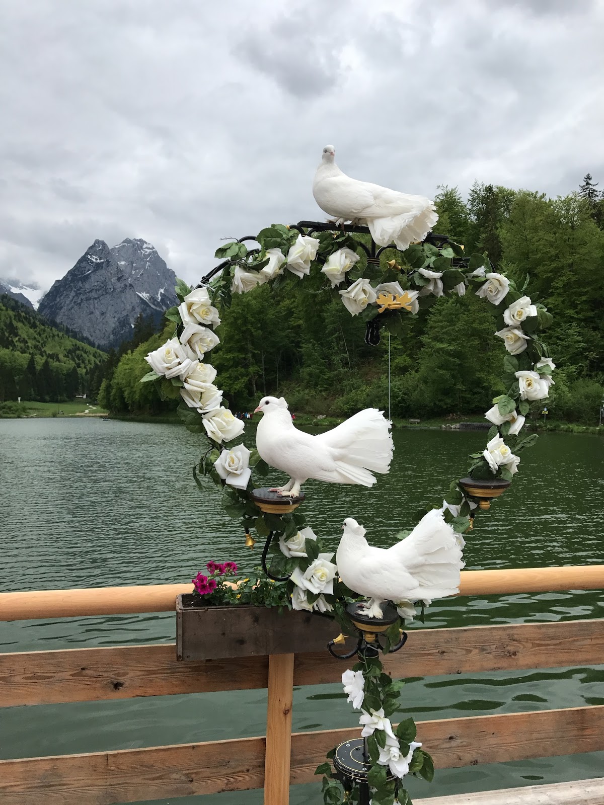 Und eine Premiere hatten wir auch: Erstmals gab es eigens aus München angereiste Hochzeitstauben am Riessersee, die spielerisch die Gäste unterhielten. Die sogenannten Pfauen-Tauben kletterten gurrend über ein großes Efeu-Herz und waren sogar so zutraulich, dass sie auf der Hand landeten.