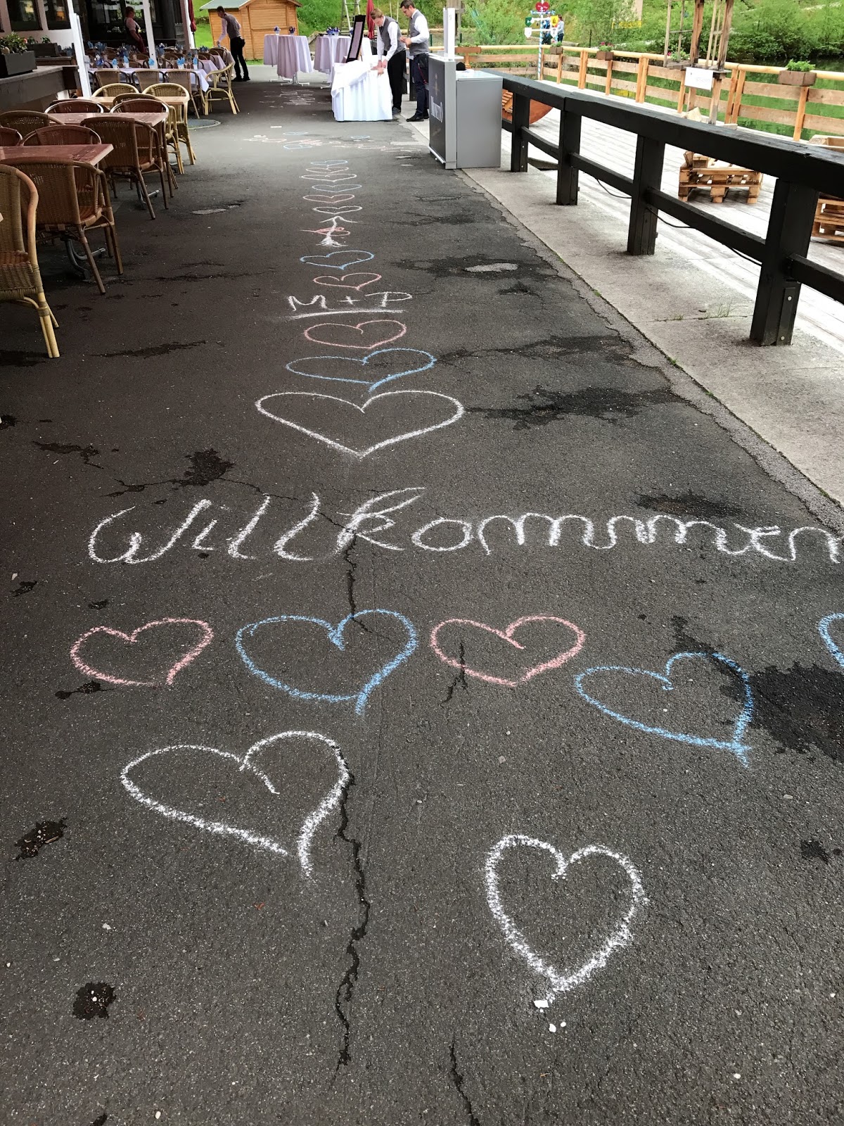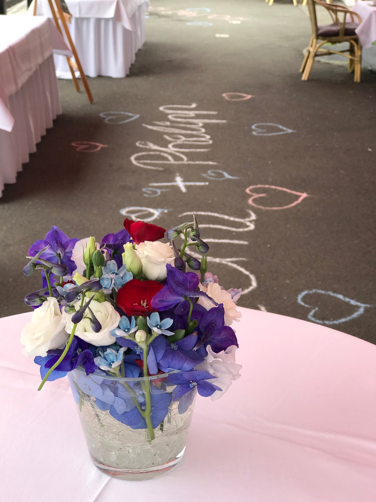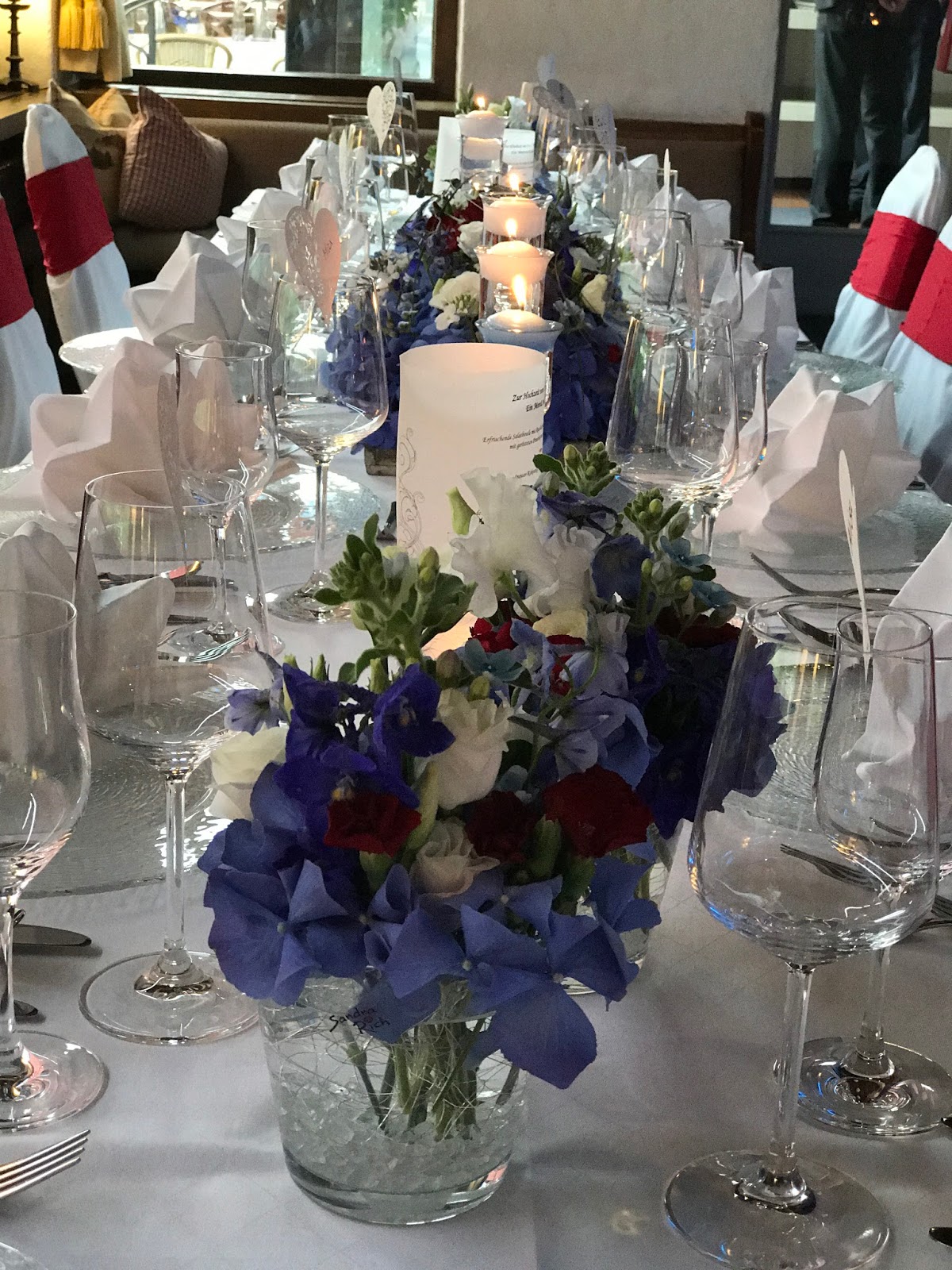 Den Boden hatten wir auf besonderen Wunsch des Brautpaares mit Kreideschrift in den Hochzeitsfarben Blau, Rot und Weiß beschriftet, dazu passend war auch der Blumenschmuck für die Steht- und Kaffeetische.
