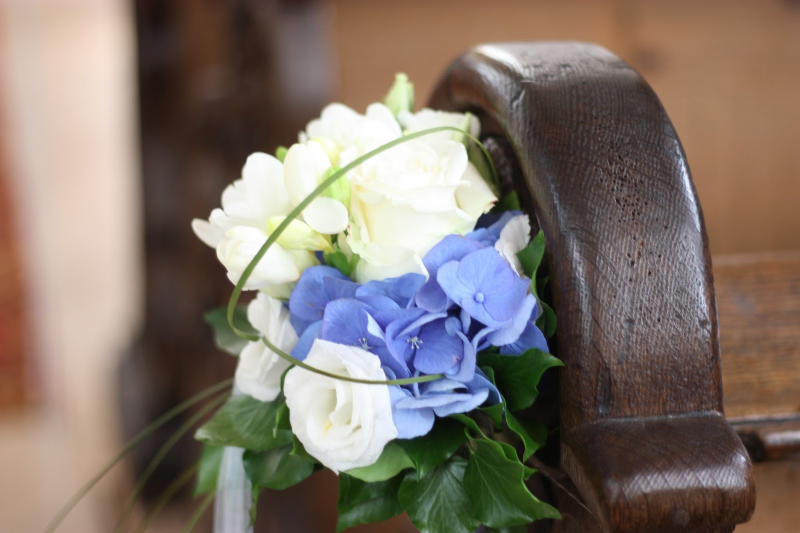 Der Brautstrauß (Passiflori Blumen Penzberg) war in verschiedenen Blautönen mit Rot, zierlich und rund gebunden und mit Gräsern umschlungen.