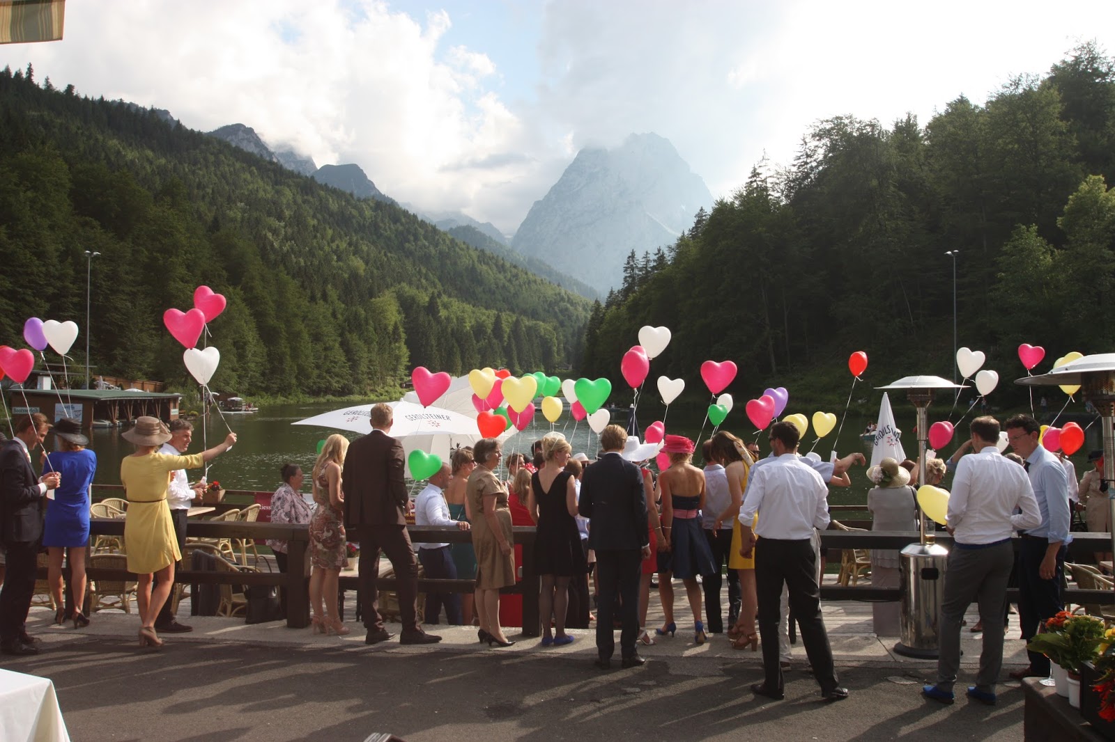 Der Höhepunkt dieses strahlenden Sommernachmittags war der Ballonflug. Die Trauzeugen und Freunde des Brautpaares hatten leuchtend-bunte mit Helium gefüllte Herzballons organisiert, die zunächst im Eingang des Seehauses zwischengelagert wurden und dann als Überraschung nach einem Ständchen für das Brautpaar verteilt wurden.