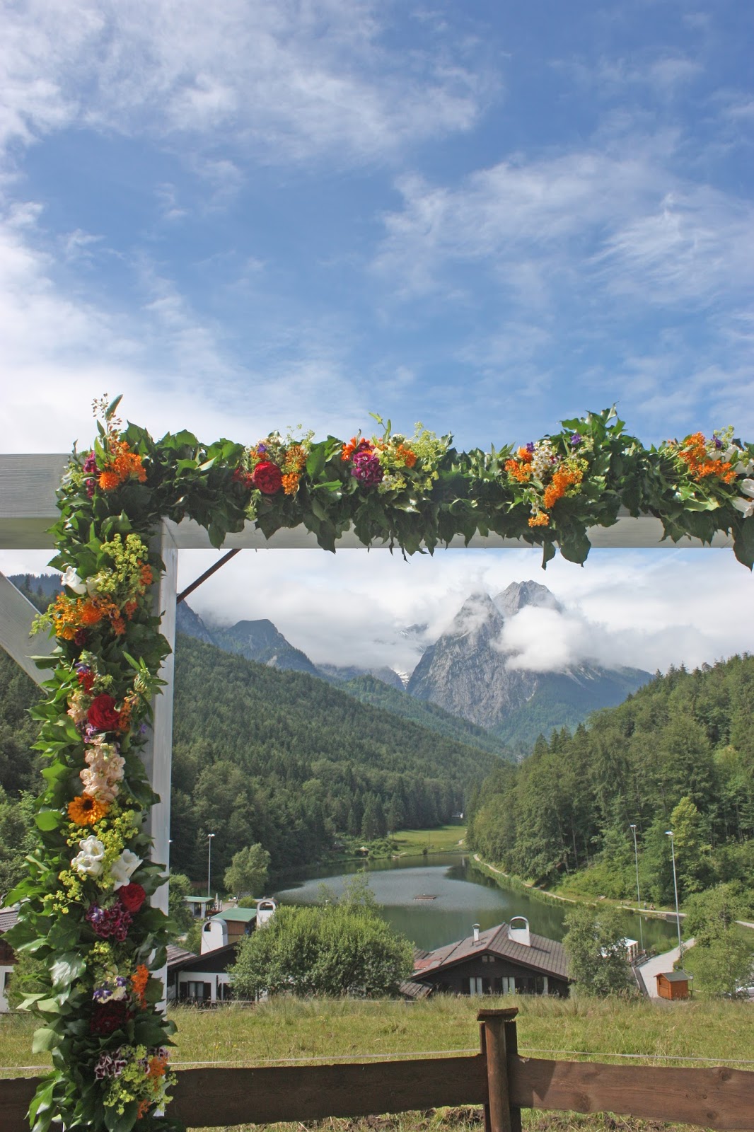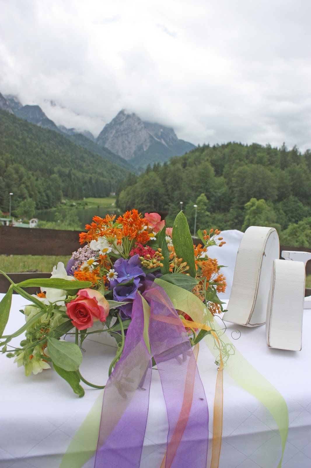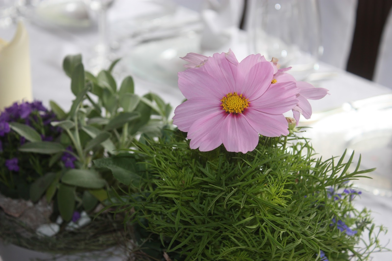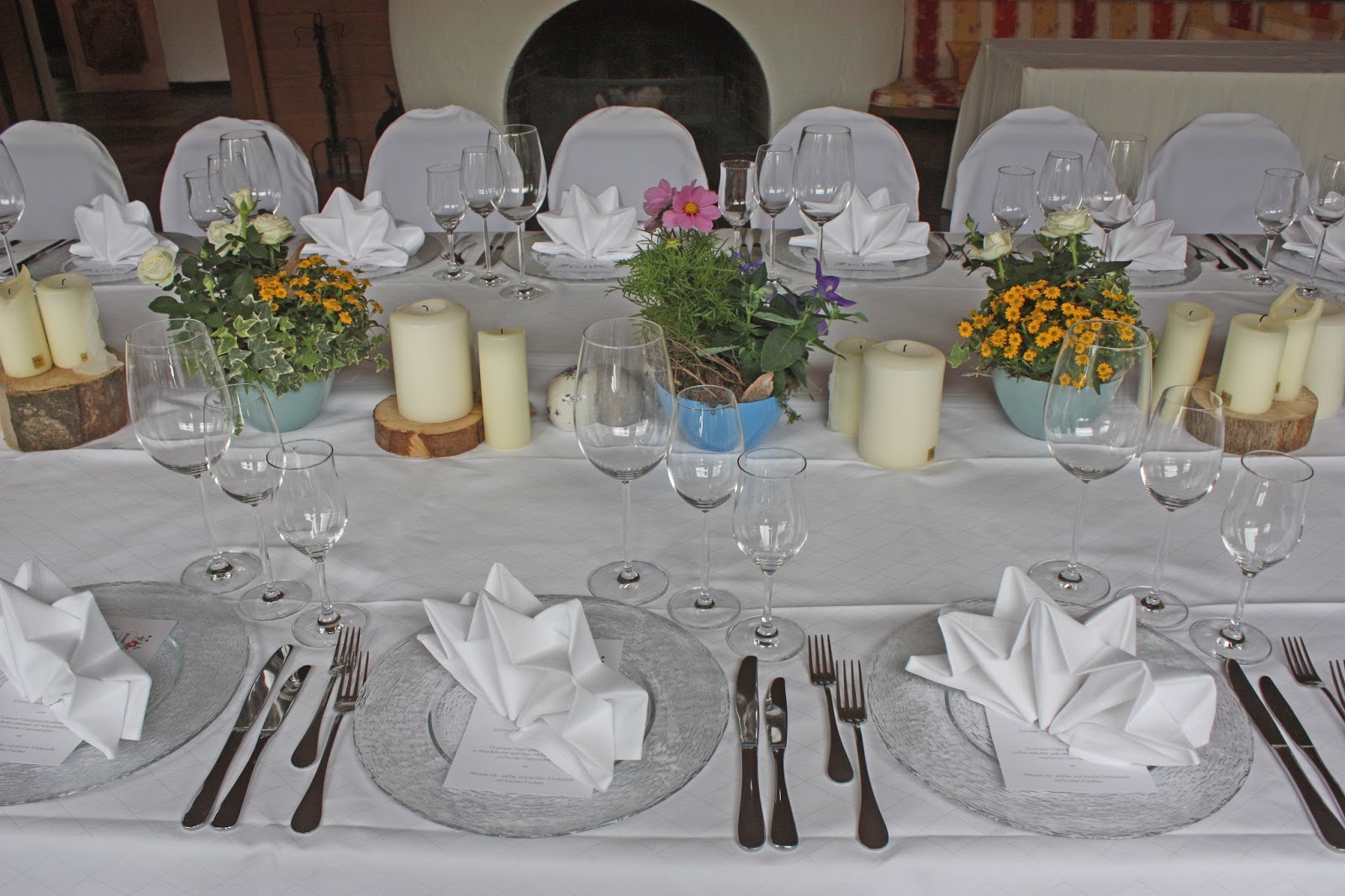 Die Tafel im Kaminzimmer im Seehaus am Riessersee war wiederum in der Basis festlich weiß gedeckt: Weiße Tischwäsche und Servietten, weiße Stuhlhussen, durchsichtige Glasplatzteller. Die fröhlich-bunte Mitte bildete eine Batterie aus getopften Blumen-Arrangements, Kräutern und Gräsern, dazu wurden dicke Kerzen in verschiedenen Höhen mit Baumstammscheiben arrangiert. Da die Sommerblumen von Passiflori alle samt Wurzelwerk gepflanzt waren, konnten Brautpaar und Gäste diese später mit nach Hause nehmen und in den heimischen Gärten werden sie hoffentlich noch viele Jahre weiterleben.