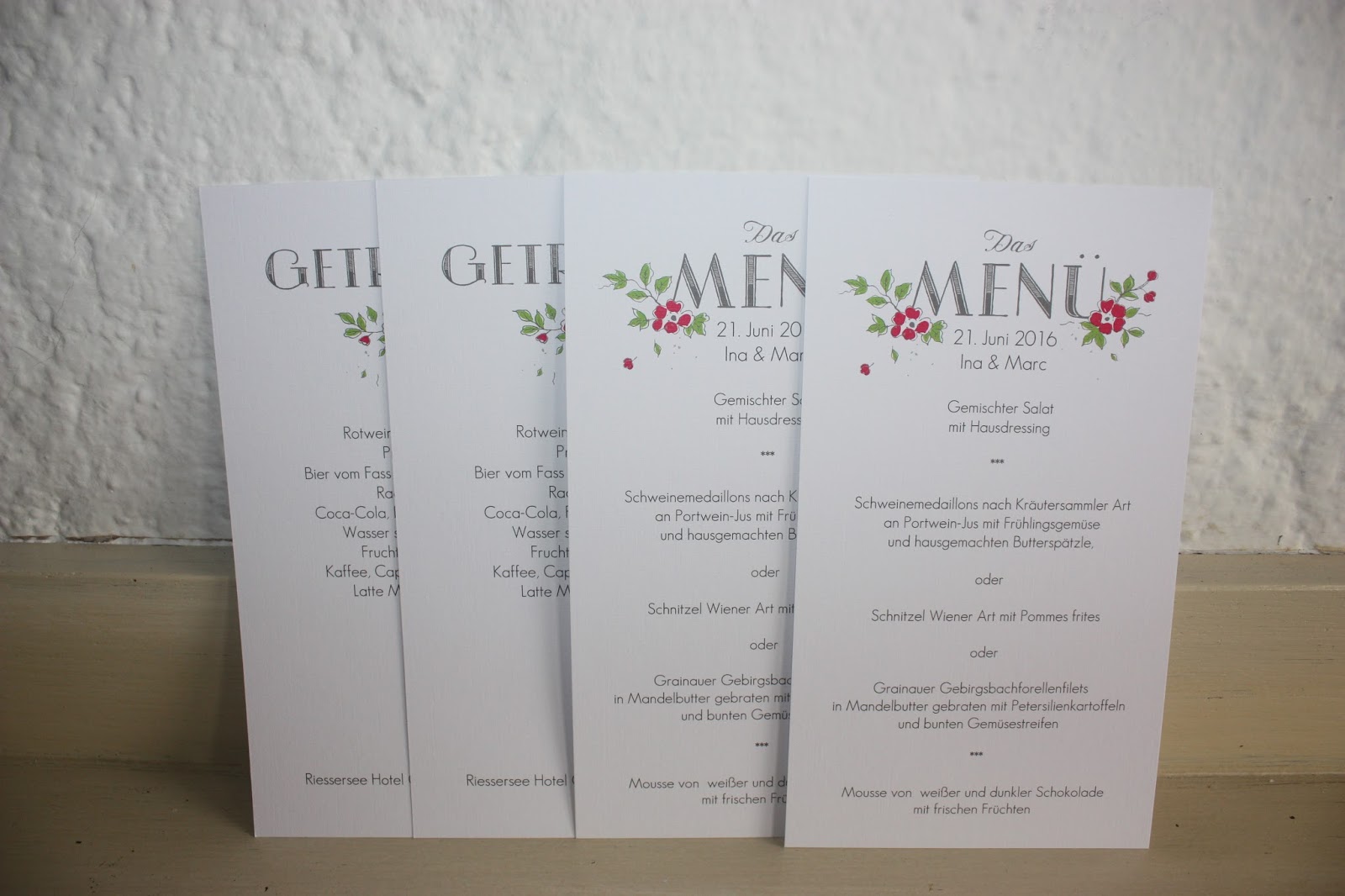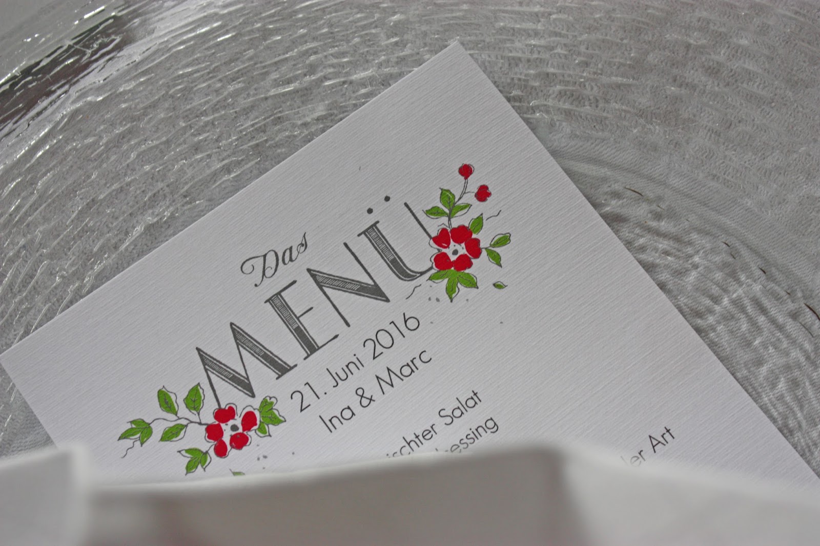 Die Menükarten aus weißem Strukturpapier im Din-Lang-Format waren dezent mit grauer, klarer Schrift gestaltet (Die Kartenmacherei) und mit kleinen Sommerblüten verziert.