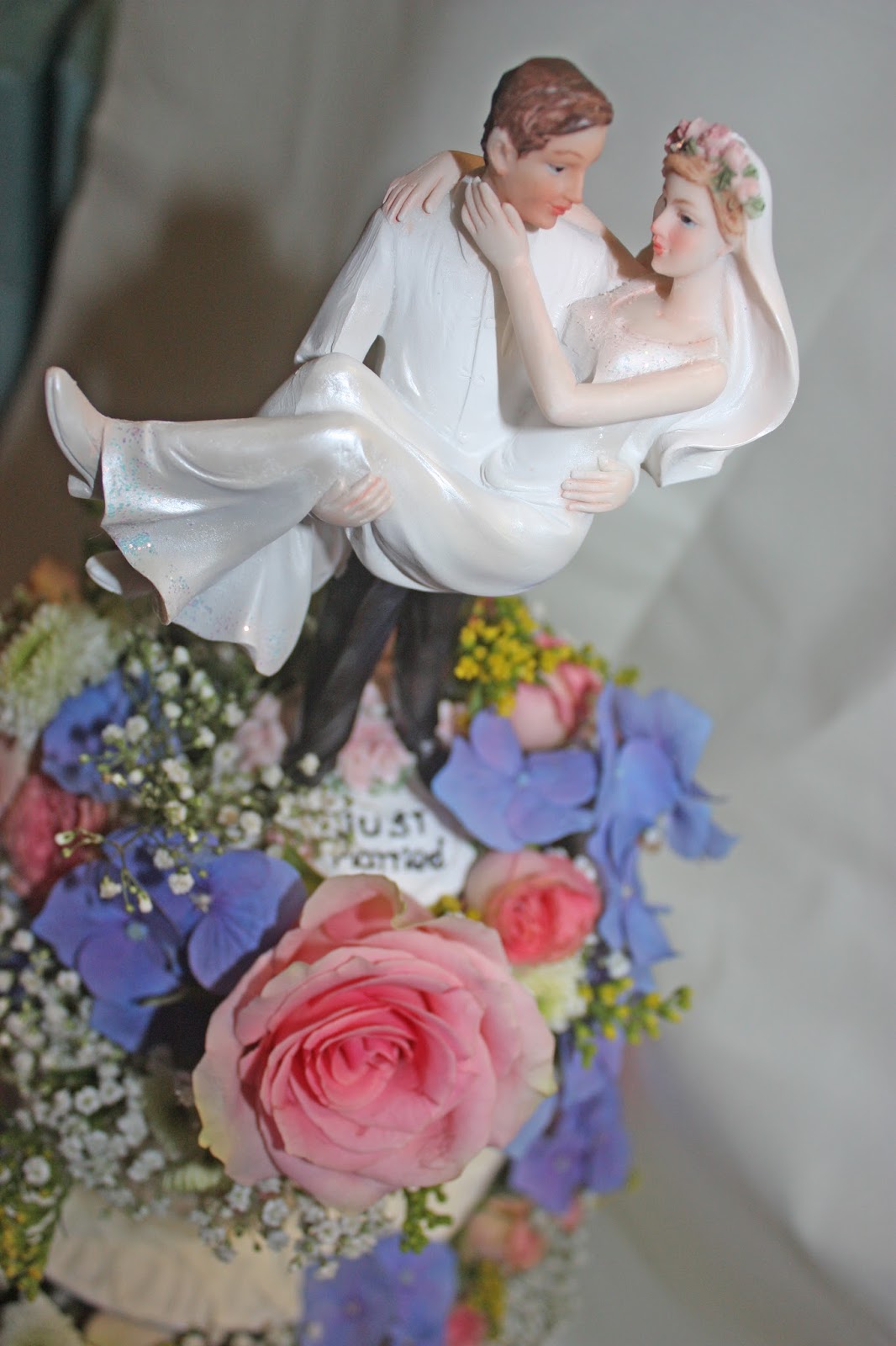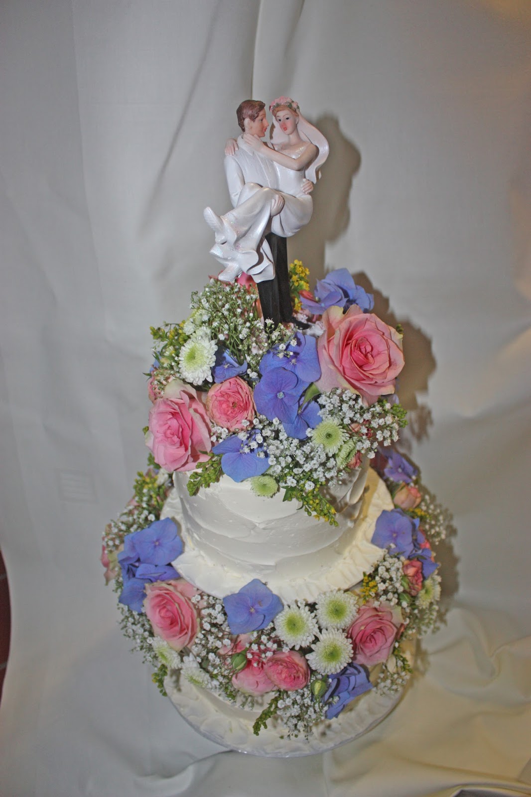Zum Kaffee gab es ganz klassisch die Hochzeitstorte: Die Konditorei Krönner in Garmisch-Partenkirchen hatte die Wunschtorten des Brautpaares – Erdbeertorte und Walnuss-Sahne – auf eine Etagere gestellt, weiß verziert und die Freiräume zwischen den Etageren-Böden mit echten, bunten Blumen aufgefüllt. Die konnte man zwar nicht essen, aber natürlich waren sie ungiftig und unbehandelt, so dass sie dem köstlichen Geschmack der Hochzeitstorte nicht schadeten. Das elegante Brautpaar als Cake-Topper hatten Braut und Bräutigam selbst ausgesucht und mitgebracht.