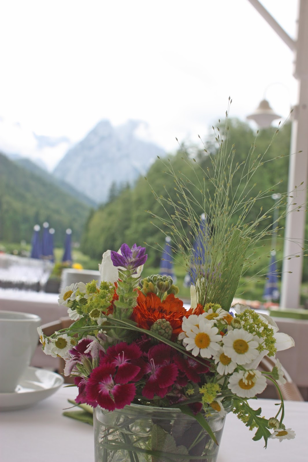 Zur Kaffeezeit war es leider nicht mehr ganz so sonnig, dennoch wirkte die Kaffeetafel – gedeckt auf der Seeterrasse mit Berg- und Seeblick – mit frischen, grünen Servietten und kleinen Gläsern mit bunten Wiesenblumensträußchen einladend.