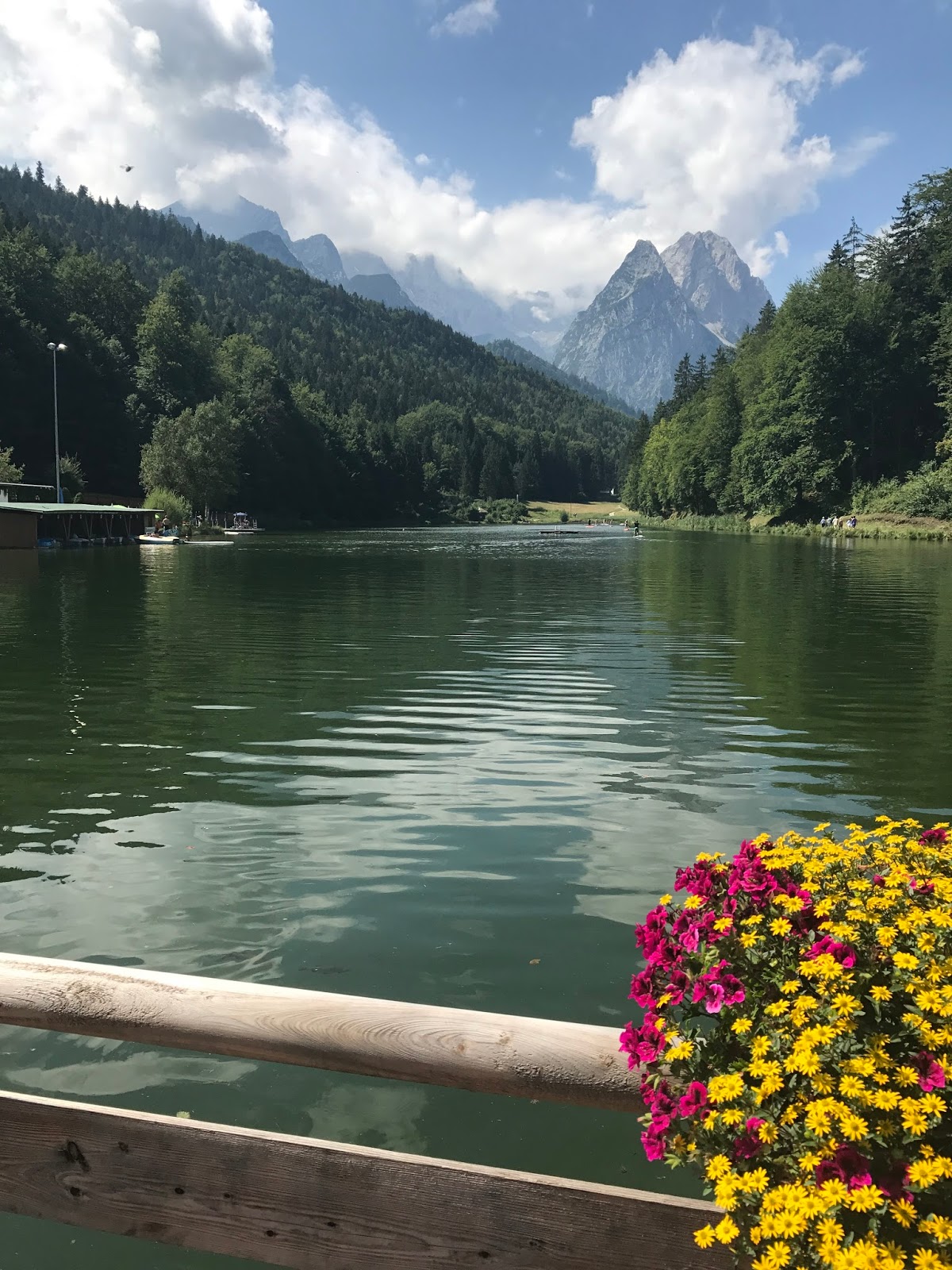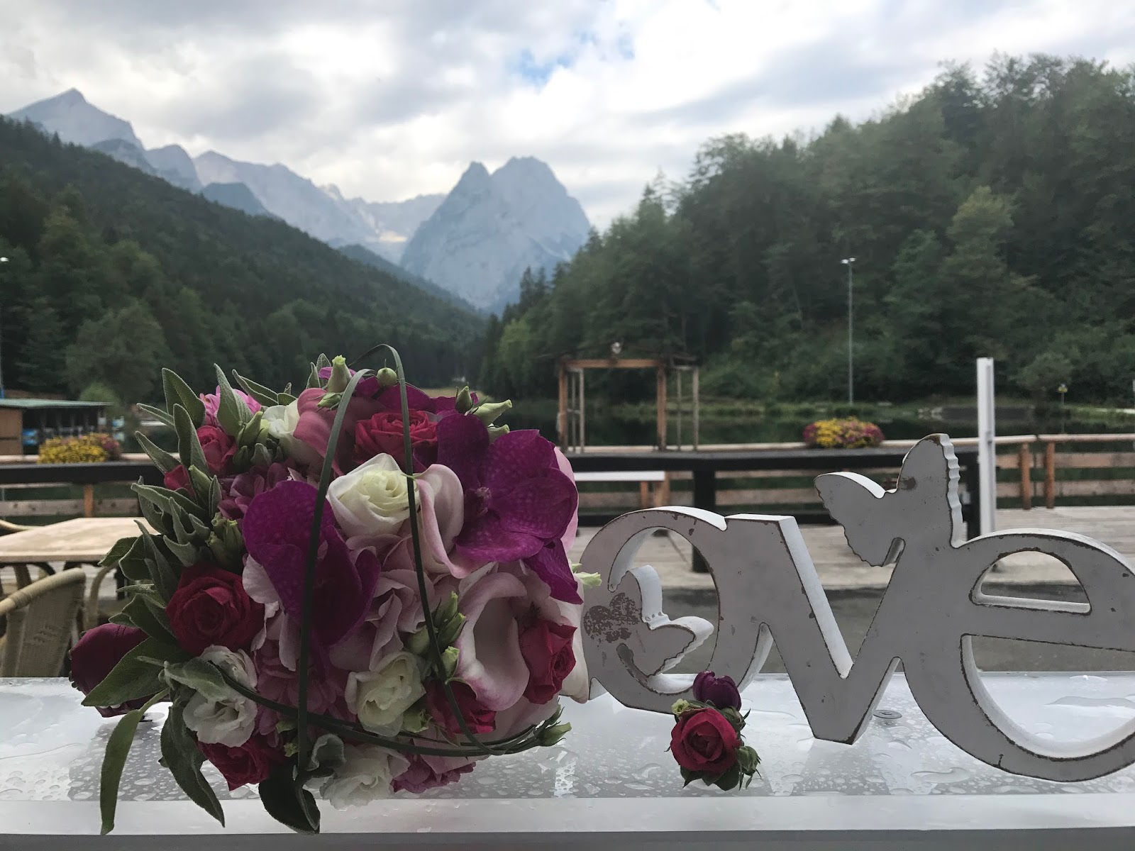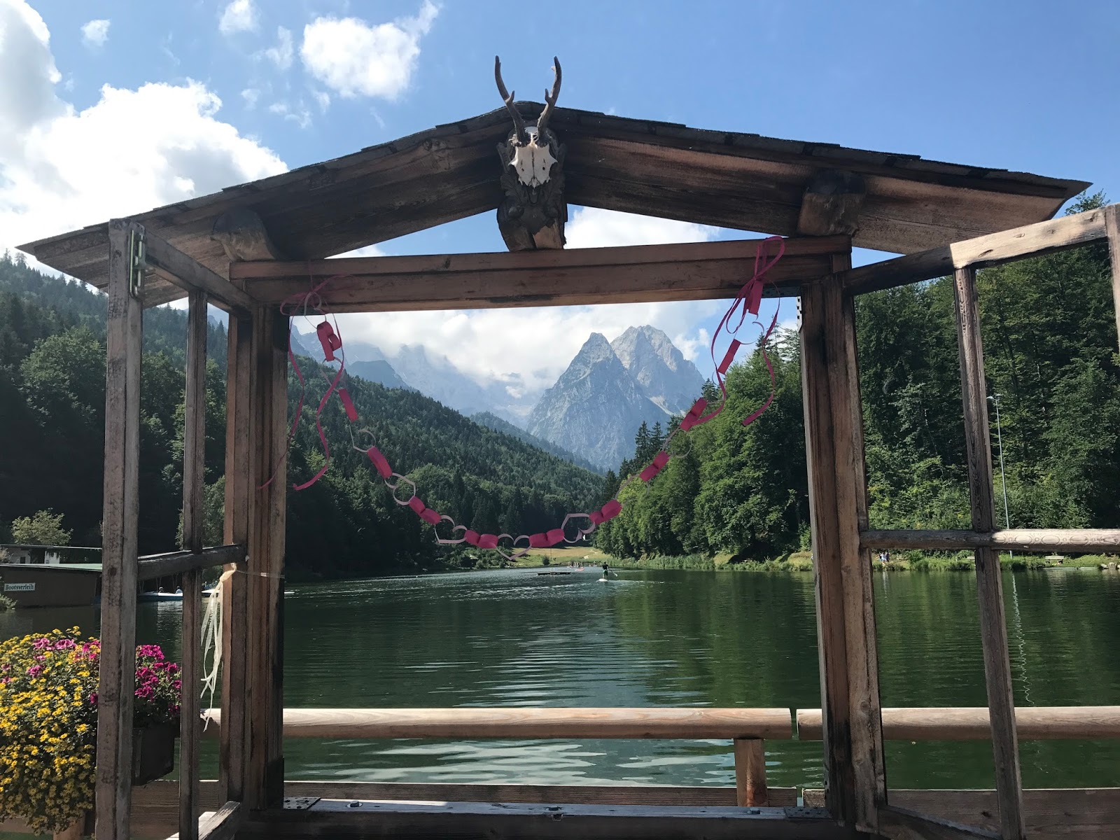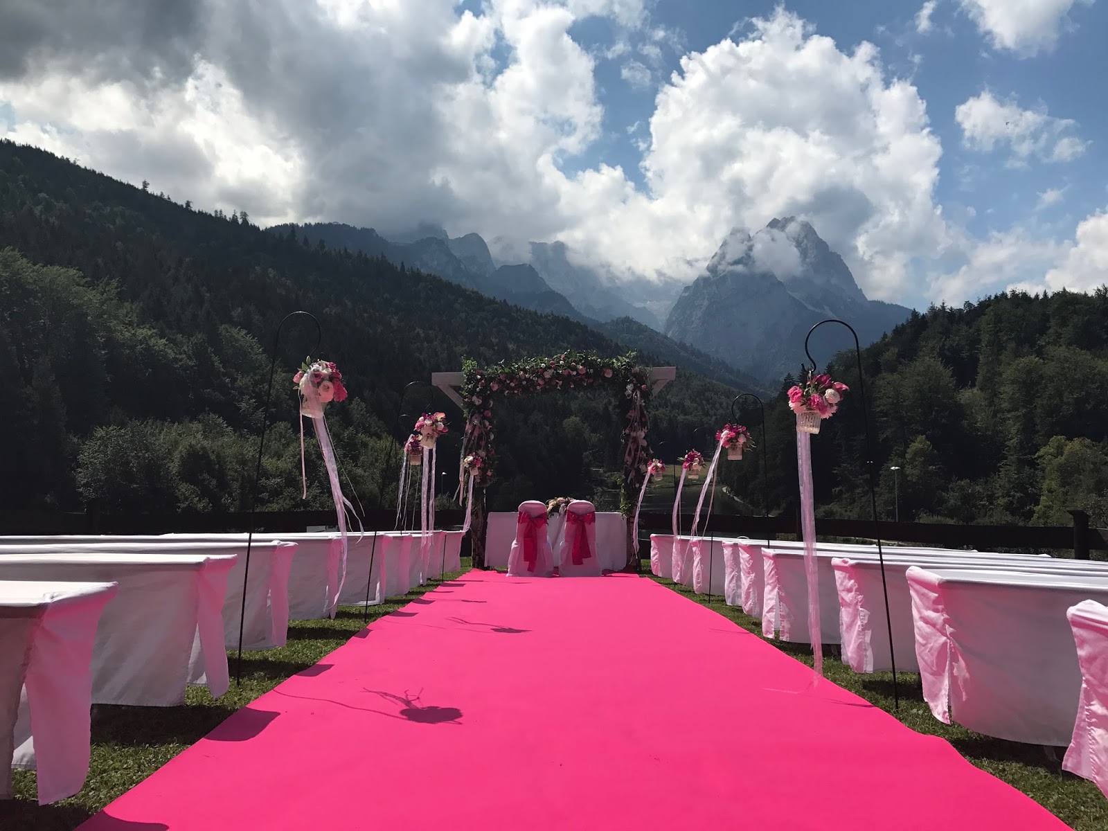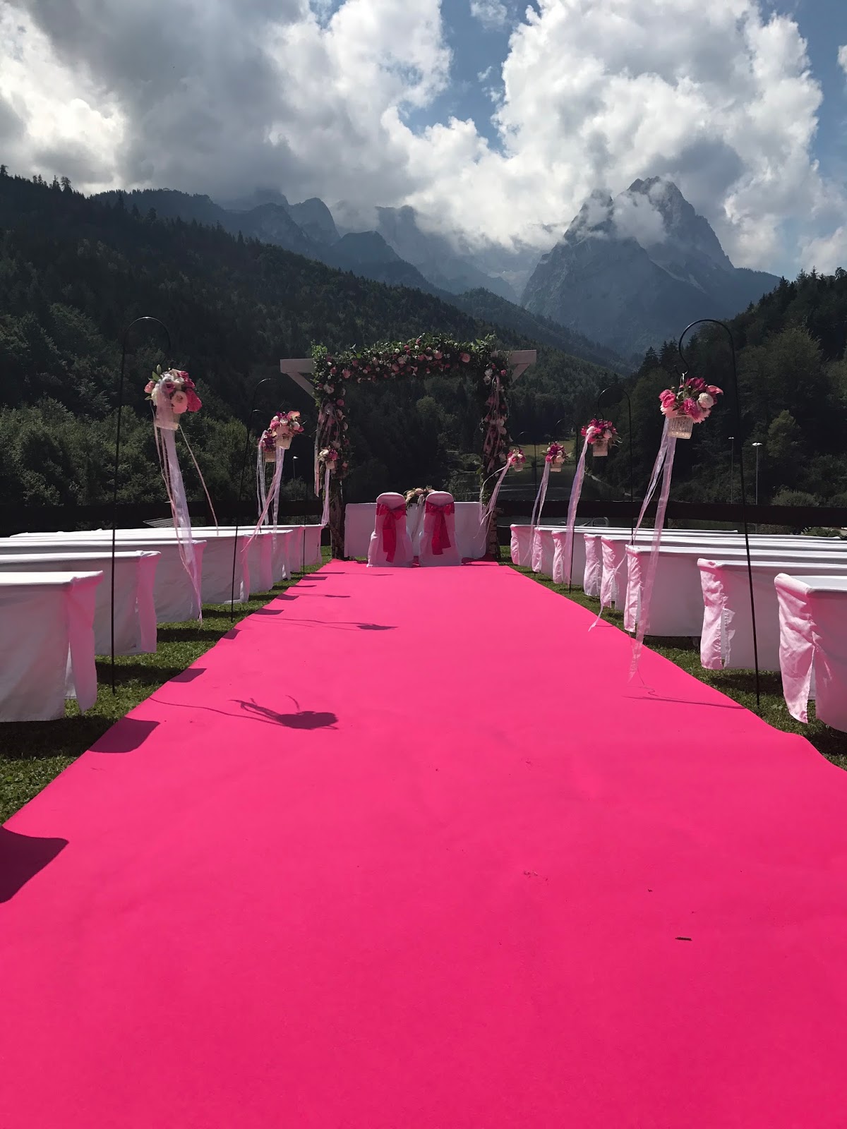 So ausgestattet konnte die freie Trauung auf der Bergwiese oberhalb des Seehauses beginnen. Zum Torbogen, der üppig mit frischen Blumenbouquets geschmückt war, führte ein pinkfarbener Teppich, gesäumt von Gartensteckern, an denen mit Blumen gefüllte Gläser mit langen Bändern im Sommerwind schaukelten… Die Stühle des Brautpaares wurden zusätzlich mit pinkfarbenen Stuhlschleifen dekoriert.