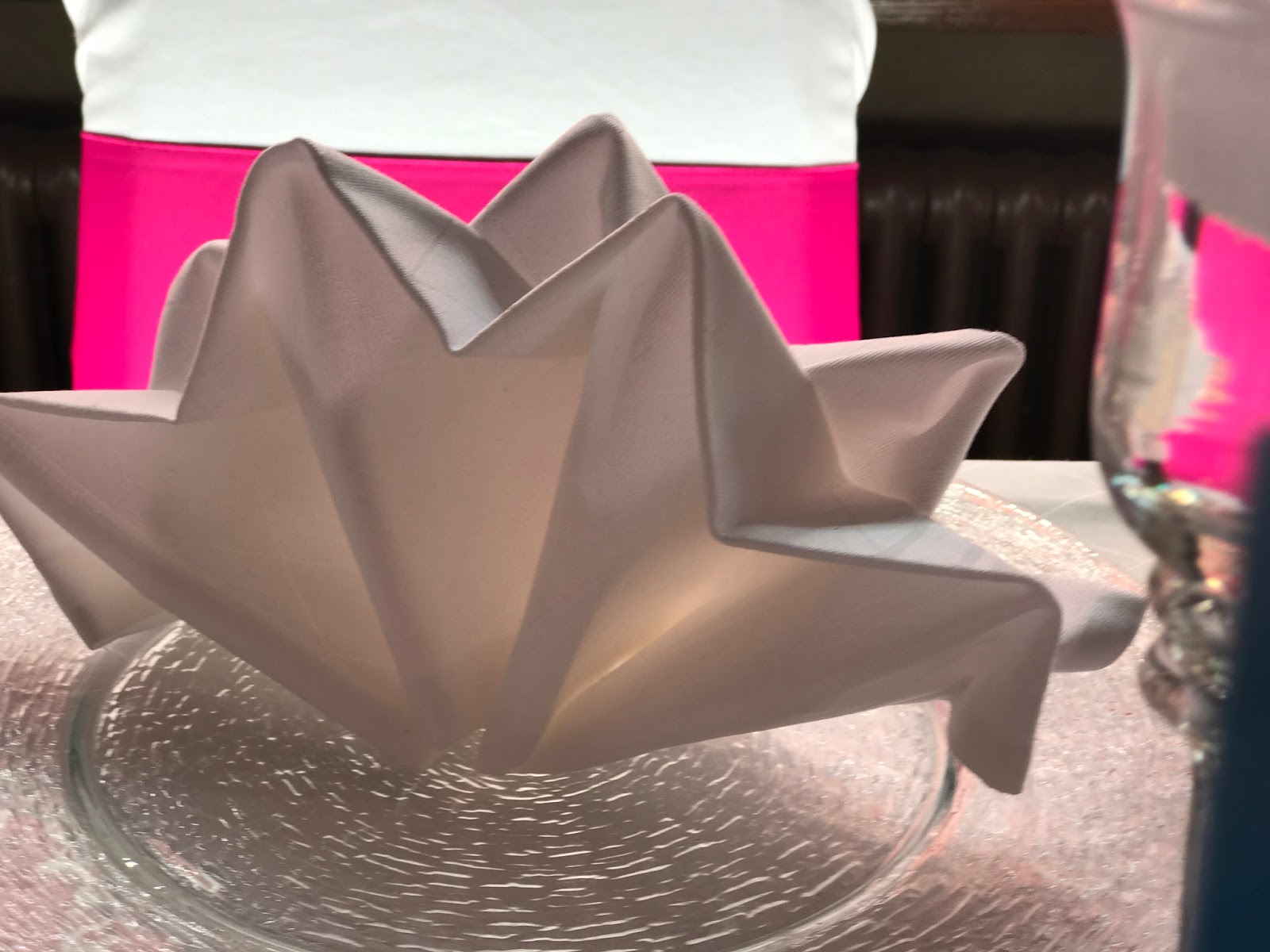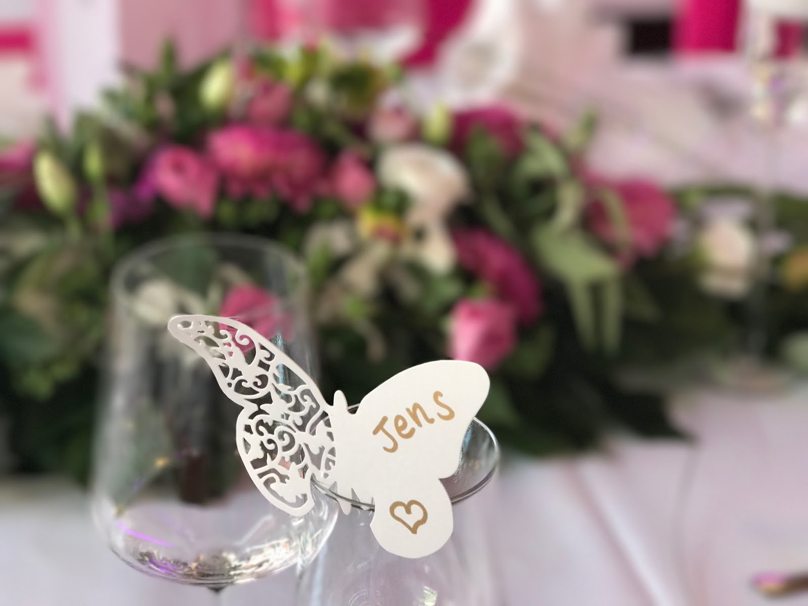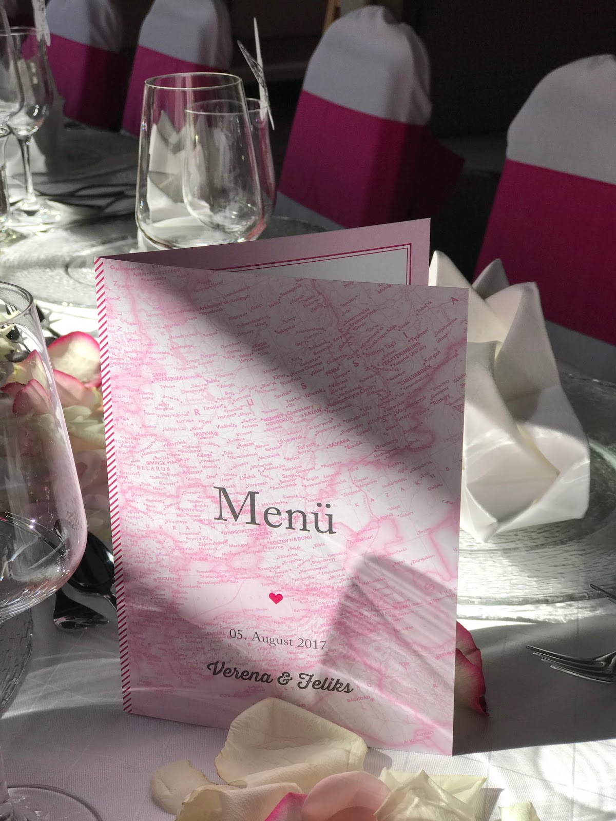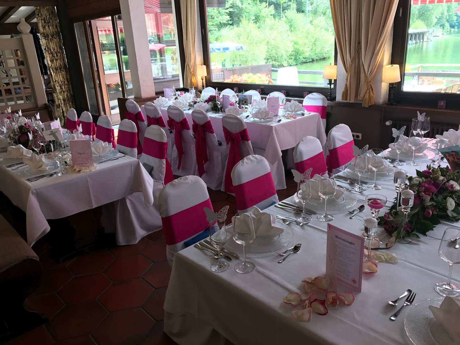 Im Seehaus war dann festlich gedeckt – natürlich in Pink Rosa und Weiß! Die weißen Hussen über den Stühlen wurden mit pinkfarbenen Schleifen geschmückt. Beim Blumenschmuck waren klassische Gestecke der Wunsch des Brautpaares, der von Passiflori mit üppig-floralen Bouquets umgesetzt wurde. Die Menükarten (die Kartenmacherei – Serie Reise ins Glück) zeigten dann ein Weltkarten-Reisethema in Rosa und Pink und kleine Spitzenschmetterlinge an den Gläsern zeigte den Hochzeitsgästen, wer wo sitzt.