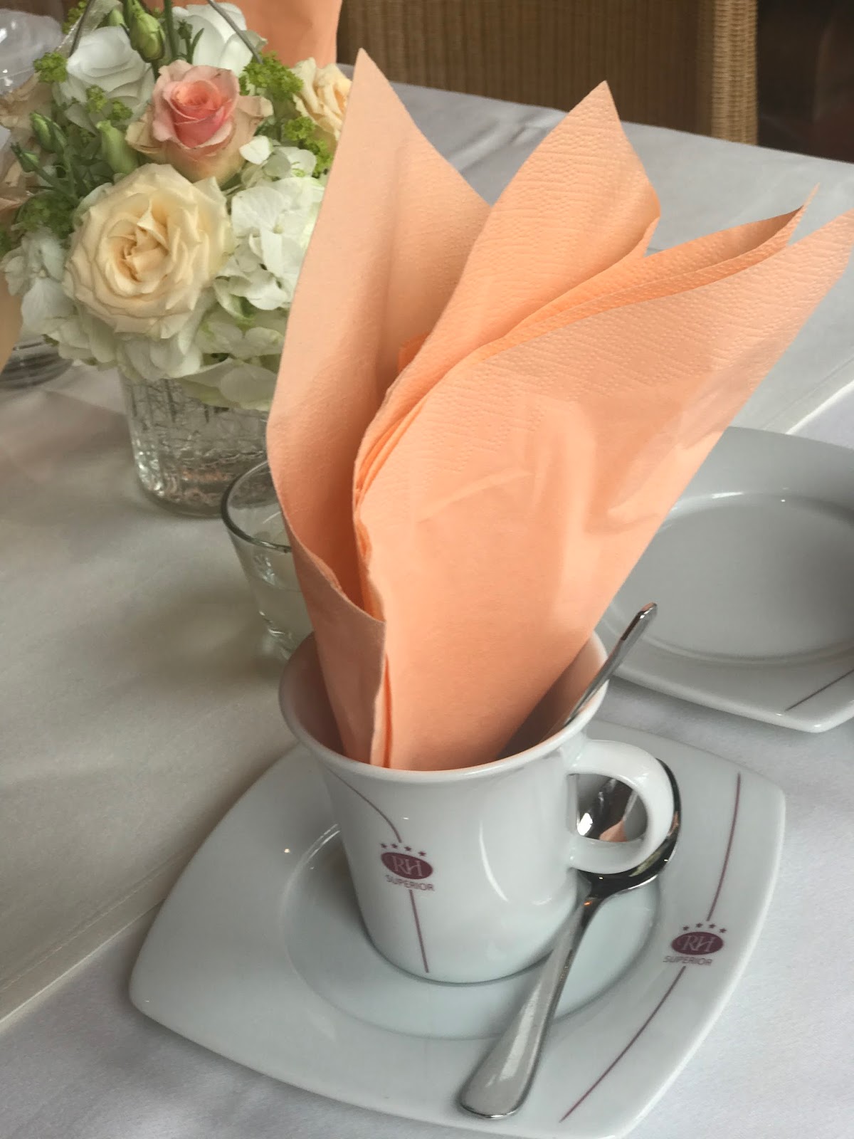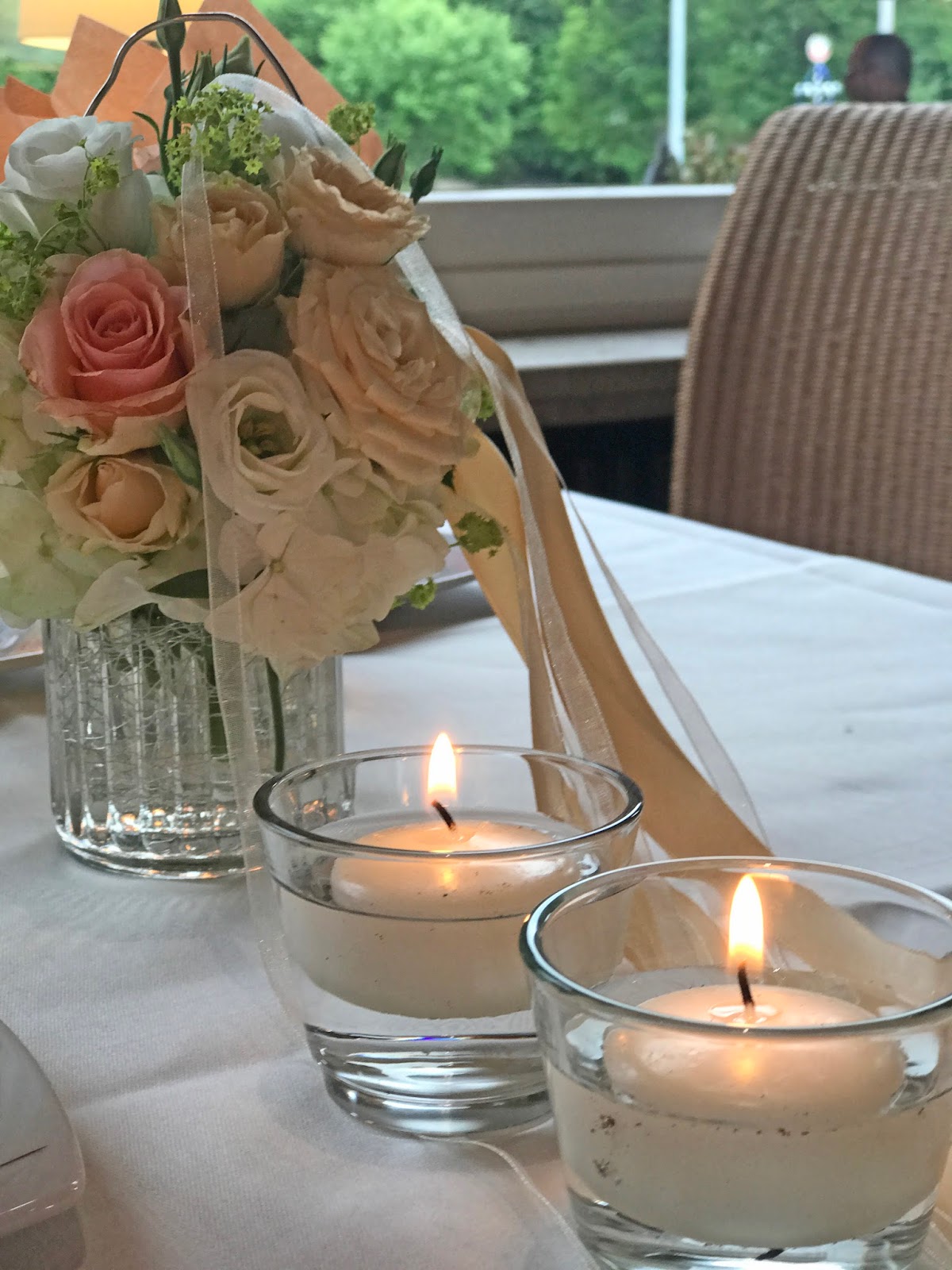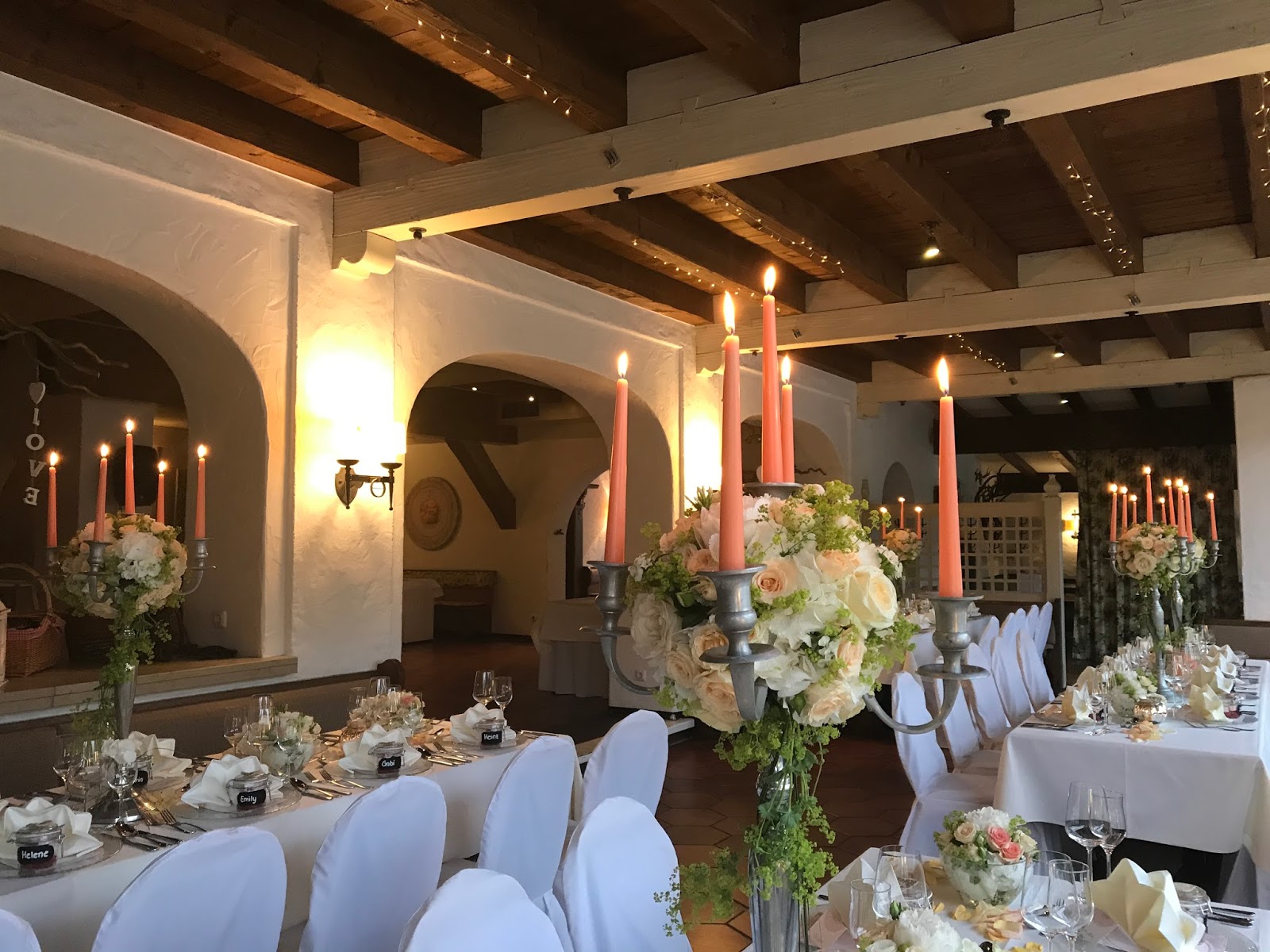 Die Tische waren mit cremefarbener Tischwäsche und Stoffservietten auf Glasplatztellern gedeckt. Die hohen Silberleuchter bildeten die Centerpieces und waren mit apricotfarbenen Kerzen bestückt und von Passiflori mit wunderschönen Blumenkugeln versehen worden. Passend dazu fanden weitere Blumenschalen und Windlichter aus Bauernsilber ihren Platz auf den Tischen.