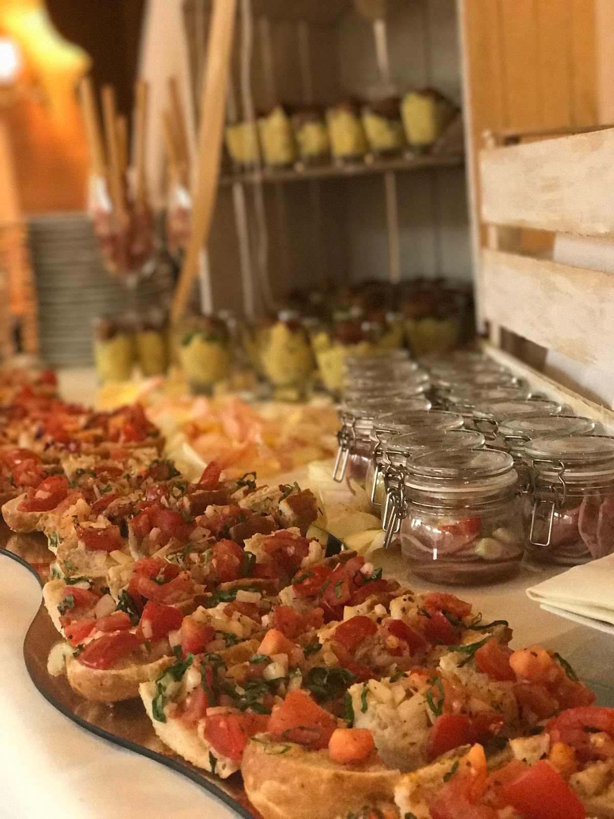 Nach der Trauung ging es ins Kaminzimmer im Seehaus zum Hochzeitsempfang, wo es neben Sprizz, Hugo und alkoholfreiem Cocktail ein großes Fingerfood-Buffet mit allerlei Köstlichkeiten gab: Caprese-Sticks, Grissini mit feinem Schinken, Kartoffelsalat im Gläschen mit Fleischbällchen, Wurstsalat in kleinen Weckgläsern und Bruschetta.