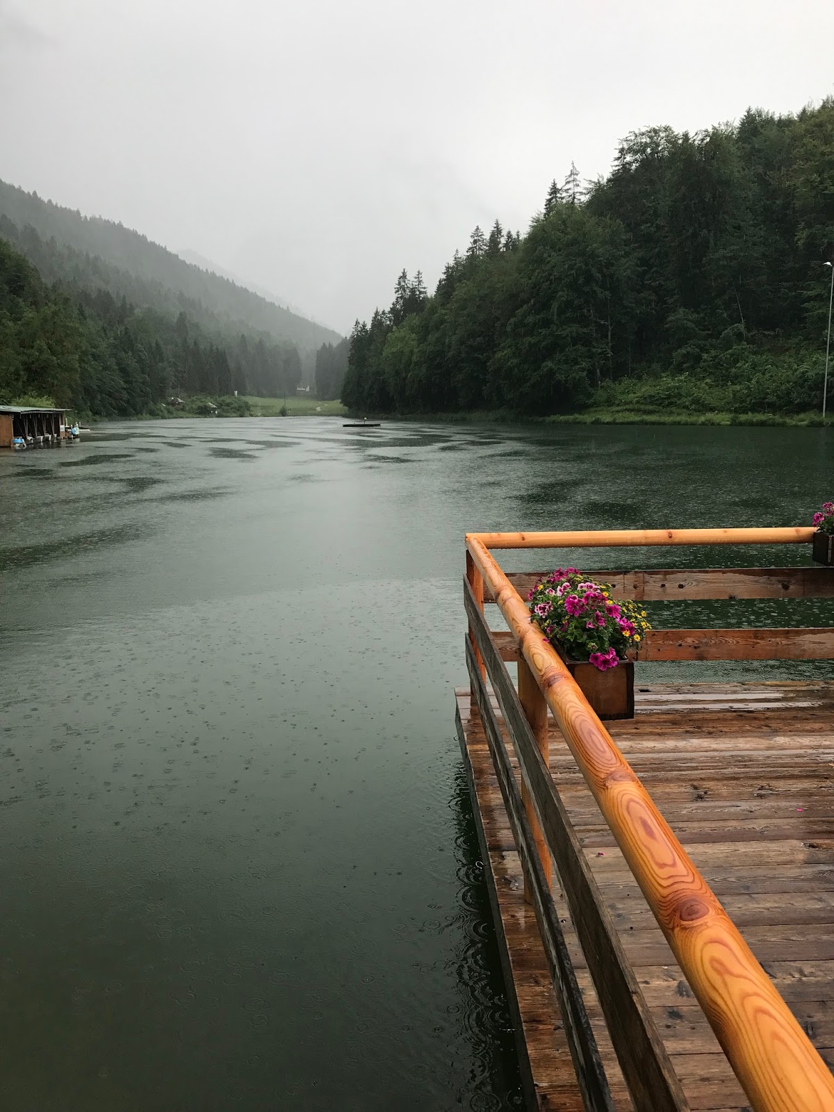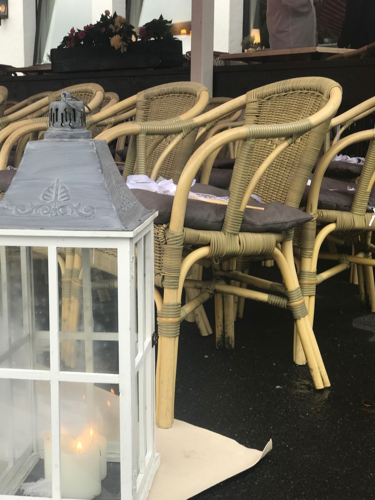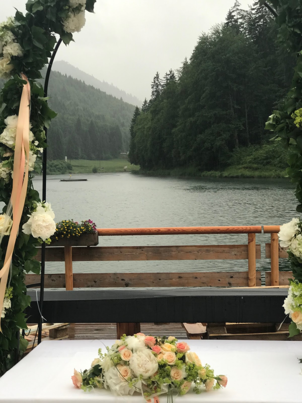 Die Hochzeitswiese über dem Seehaus war leider nass und matschig, so dass eine Trauung dort nicht in Frage kam. Da es aber am Hochzeitstag zunächst nur etwas nieselte, gingen wir das Risiko ein, die Trauung auf der Seeterrasse unter der Markise stattfinden zu lassen. Und Petrus war uns gnädig und wartete mit Donnerwetter und Dauerregen bis unmittelbar nach der Zeremonie…