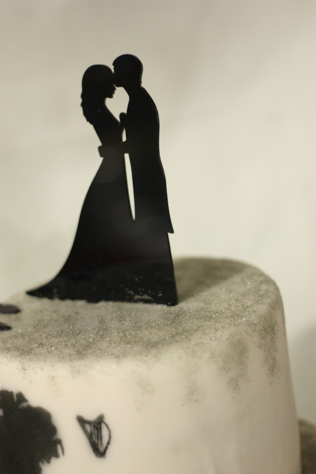Für Unterhaltung am Abend sorgte dann noch die Photo-App von Imiji.pics bevor schließlich zum Dessert die Hochzeitstorte angeschnitten wurde. Das süße Kunstwerk von der Konditorei Krönner war völlig konträr zur sonstigen Dekoration in schwarz und weiß gehalten. Das Brautpaar hatte die Torte mit der Konditorei Krönner in Garmisch-Partenkirchen direkt abgesprochen. Sie sollte die Symbole der verschiedenen Reisen – Schafe für Irland, die Freiheitsstatue für die USA, chinesische Drachen… – zeigen, was von der Konditorin mit Airbrush-Technik umgesetzt wurde. Obenauf fand sich ein Scherenschnitt-Brautpaar – und ein bisschen Glitzer rundete das Ganze ab.