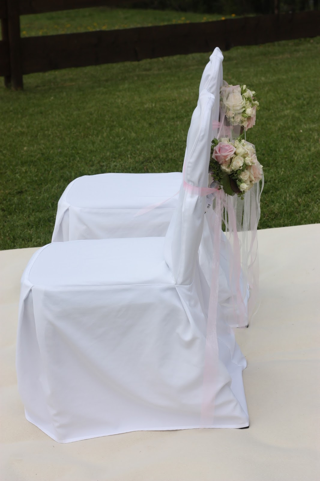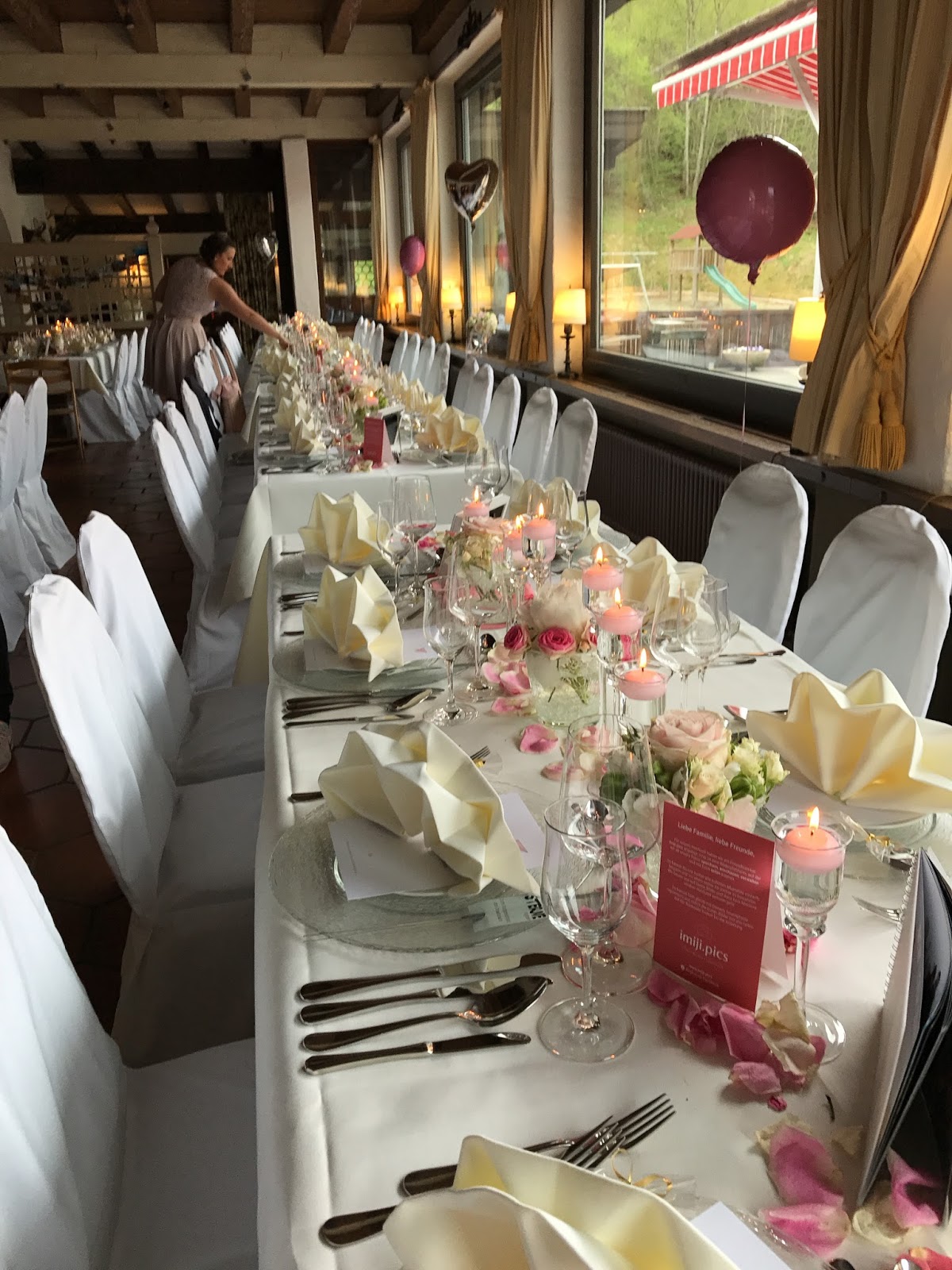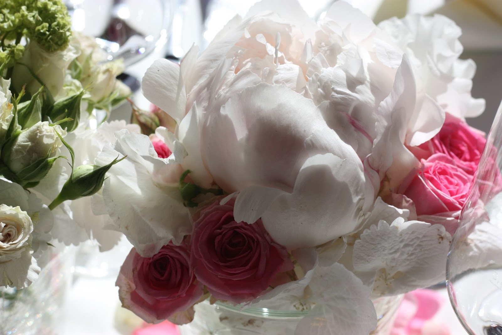 Die Tischdekoration war ebenfalls in Creme und zarten Pastelltönen von Apricot bis Rosé gehalten. Der Blumenschmuck (Passiflori Blumen Penzberg) war in großen Gläsern arrangiert und bestand überwiegend aus verschiedenen Rosen und Pfingstrosen, zusätzlich wurden zwischen den Schwimmkerzen in hohen Gläsern noch Rosenblütenblätter gestreut.