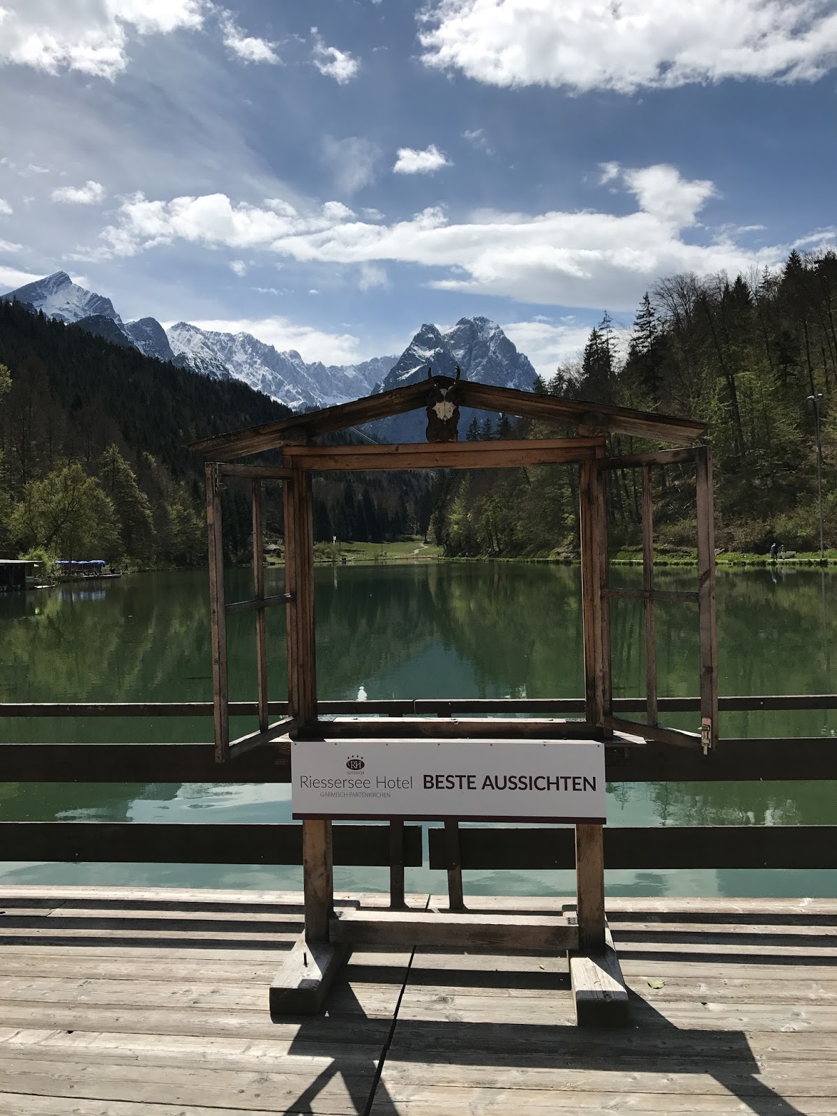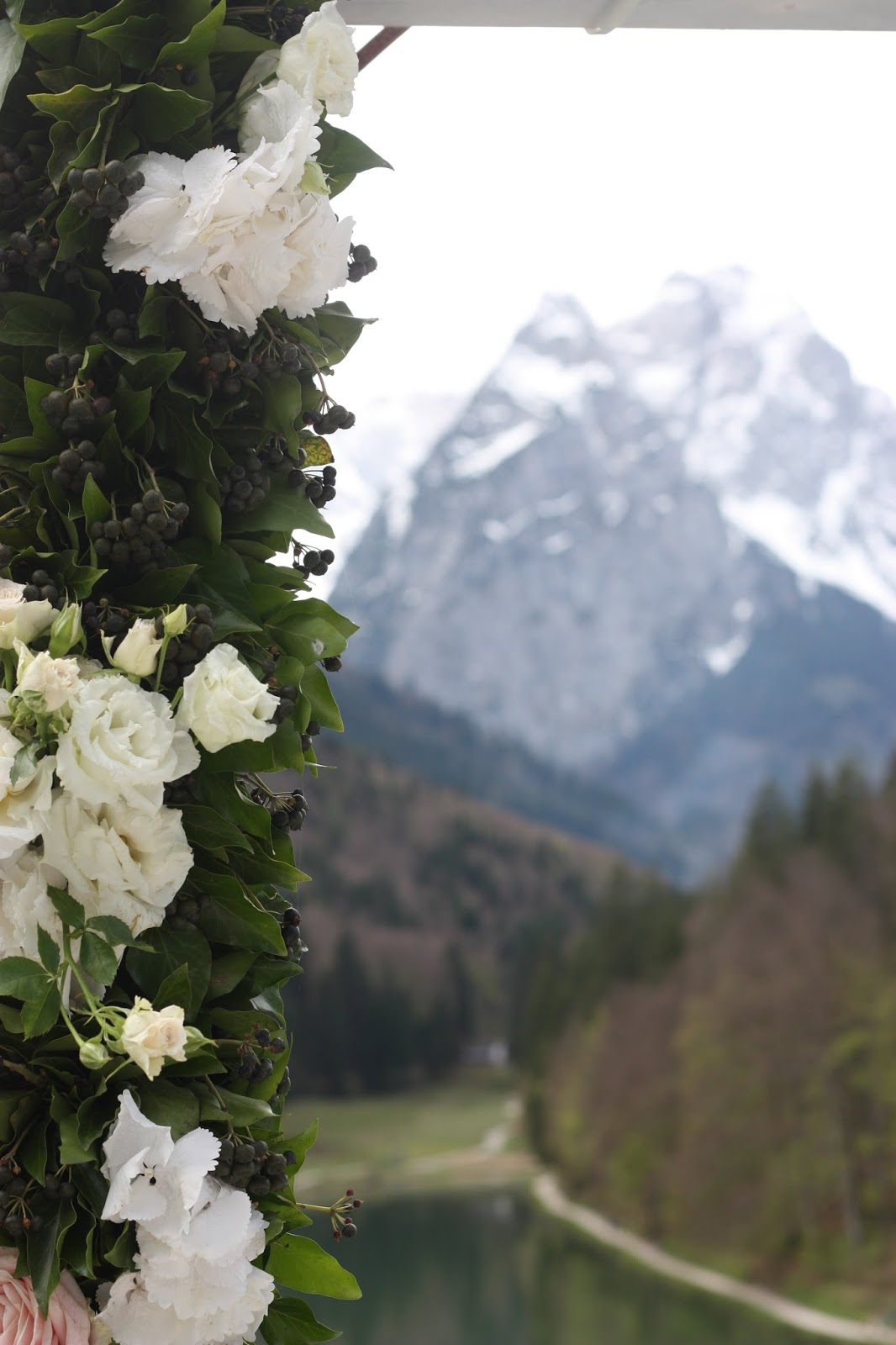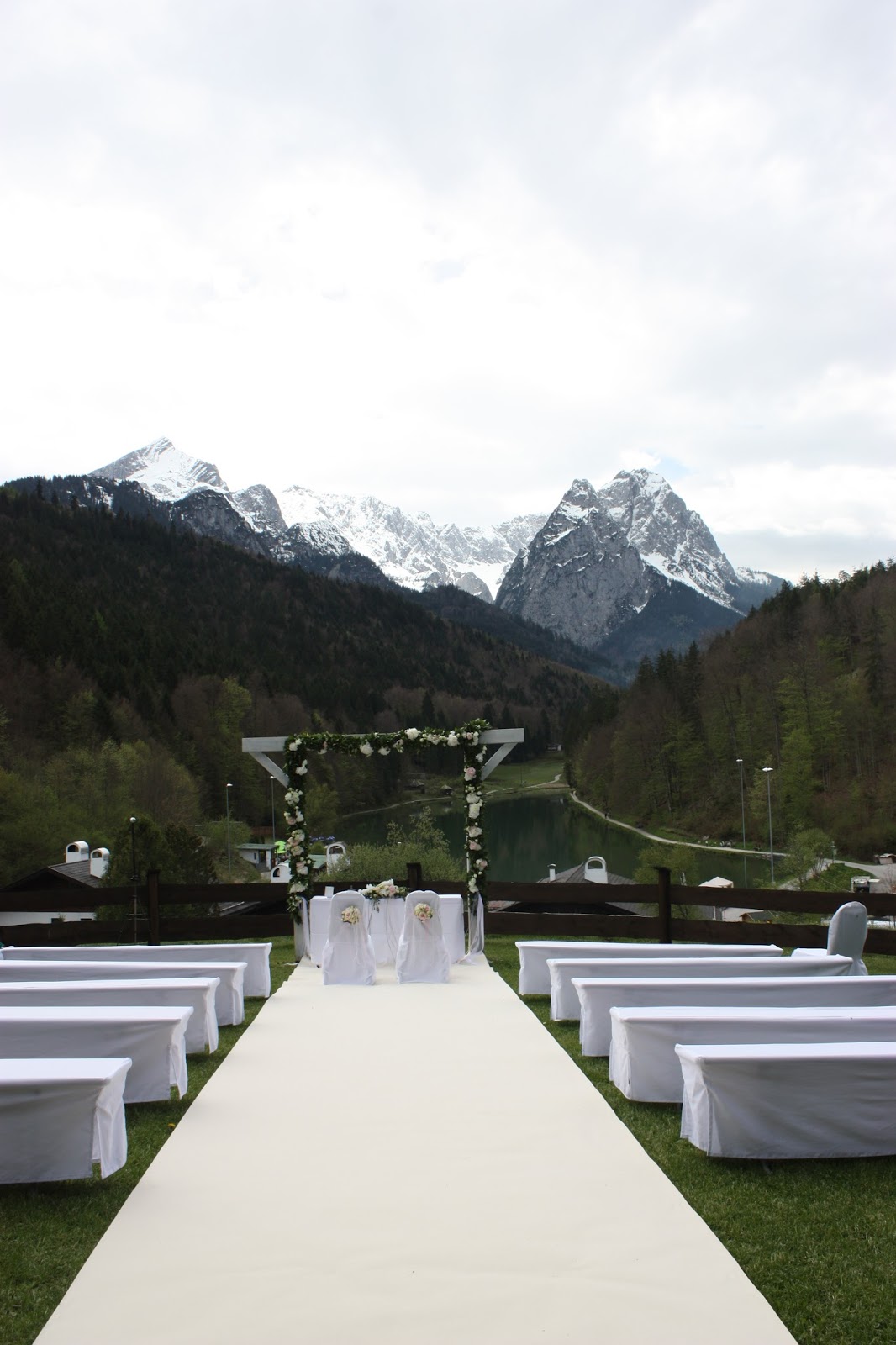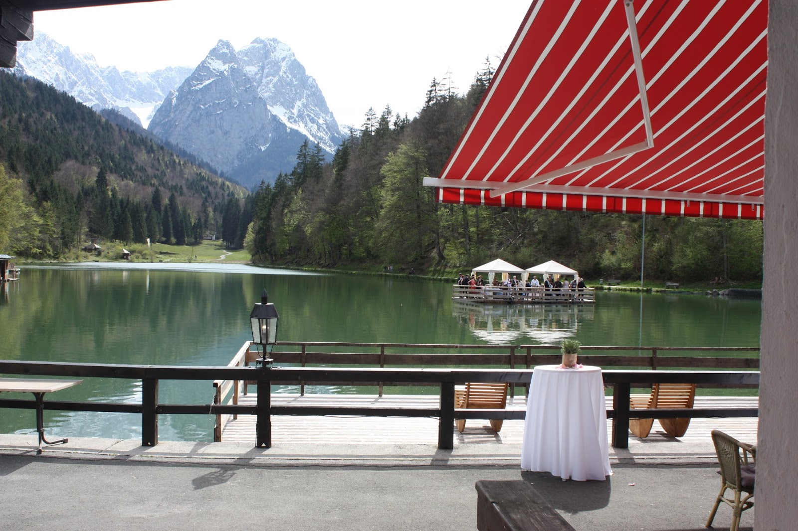 Damit es den Gästen am Nachmittag nicht langweilig wurde, stand noch eine Flossfahrt auf dem Programm. Auf dem Floss gab es natürlich auch etwas zu trinken und bei einer gemütlichen Rundfahrt auf dem Riessersee konnte man die warmen Sonnenstrahlen und das grandiose Bergpanorama genießen. Das Brautpaar wurde derweil mit dem Golfcart von Hochzeitsassistentin Franziska Mayer zum Paarshooting chauffiert.