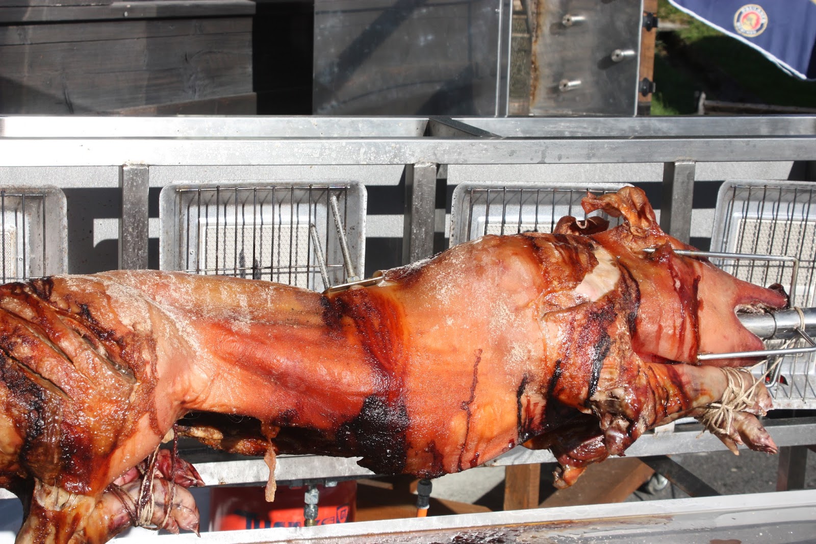 Am Ende der Terrasse dreht sich derweil schon ein duftendes Spanferkel für das Abendessen…