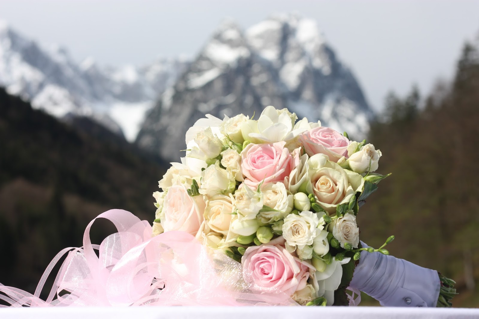 Der romantische Brautstrauß bestand überwiegend aus Rosen in Creme, Apricot und zartem Rosa, passend dazu gab es für die Trauzeugin ein Armbändchen.
